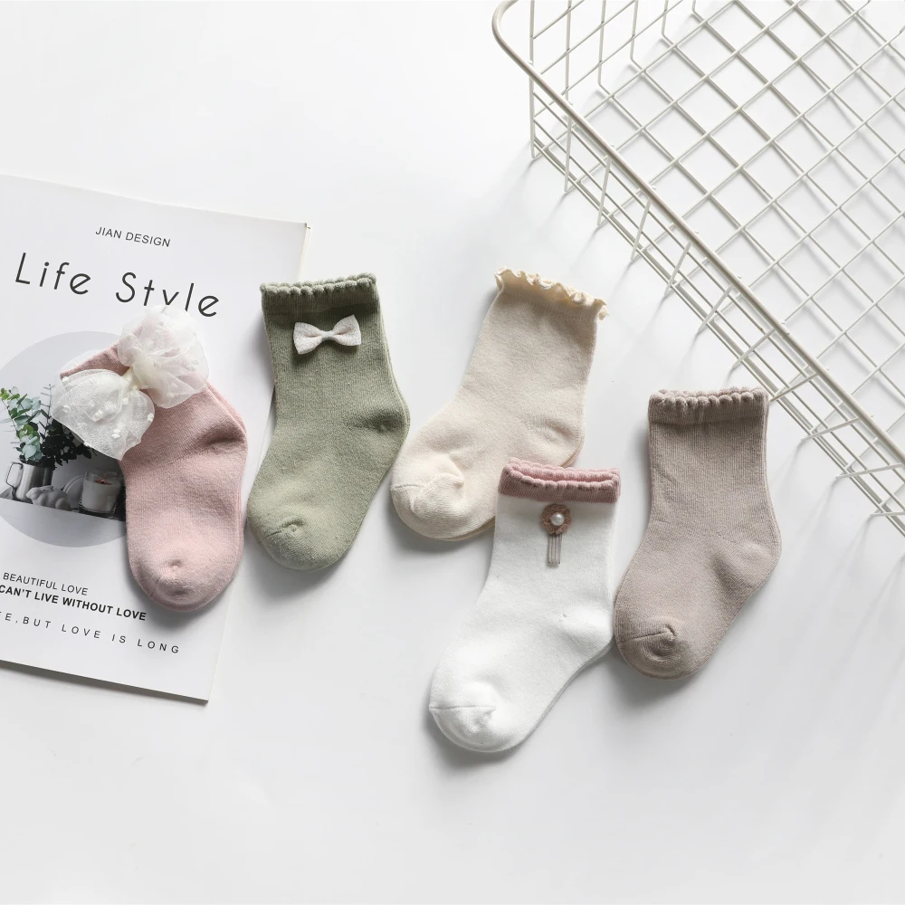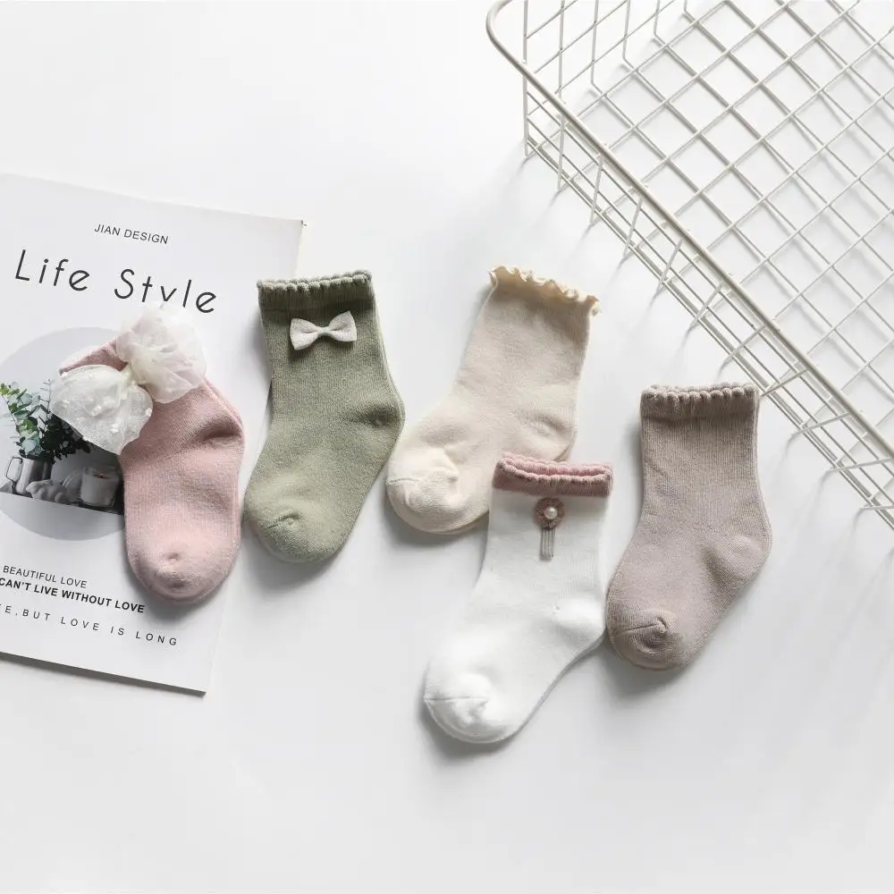 5 Pairs/lot Spring Autumn New Bow Lace Baby Socks Soft Cotton Breathable Keep Warm Floor Anti-skid Girls Socks 0-8 Years Old