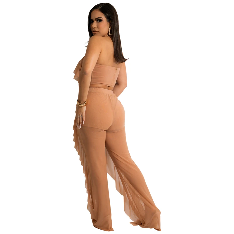 Specification: Adogirl 2022 Summer Beach Two Piece Set Ruffles Strapless Crop Top Sheer Mesh Pants with Panties Women Sexy Holiday Suit