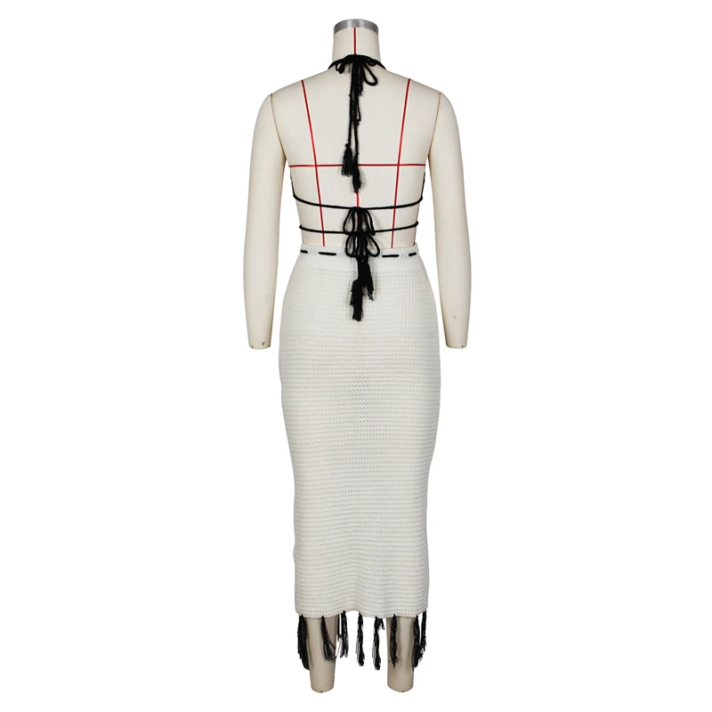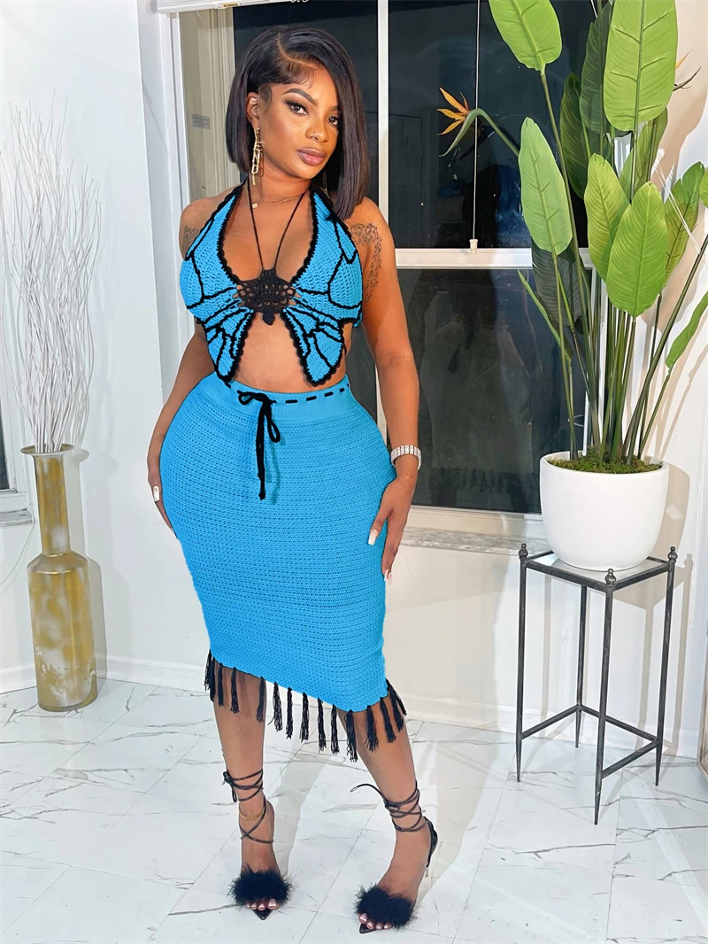 Specification: Adogirl Hand Crochet Knitted Two Piece Set Dress Women Lace Up Backless Buterfly Crop Top Tassel Midi Skirts Summer Beach Suits