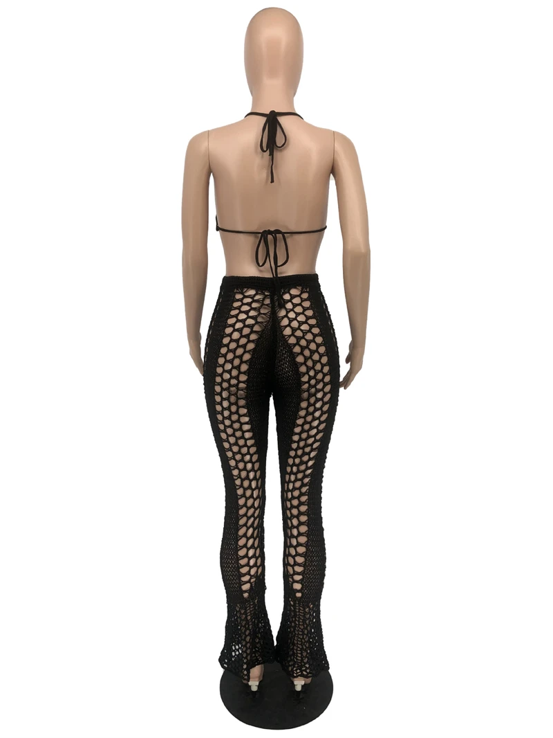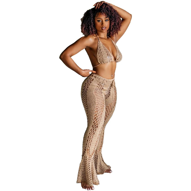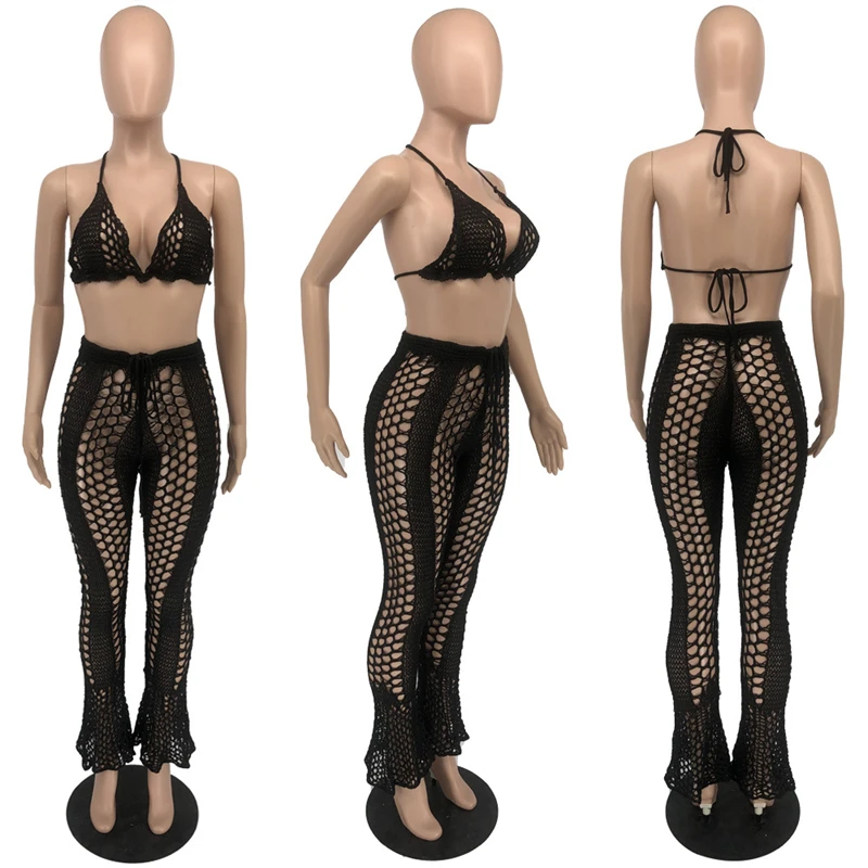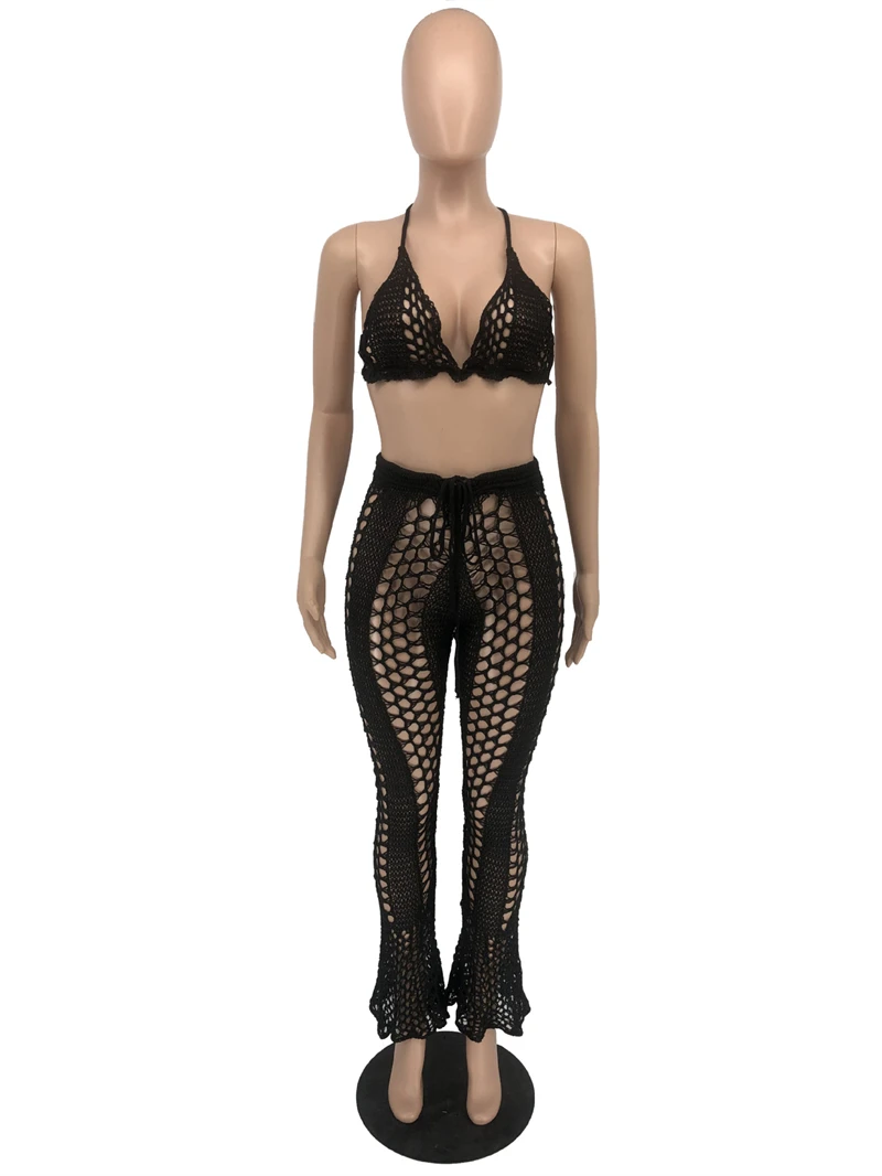 Specification: Adogirl Hand Crochet Knitted Two Piece Set Women Sexy Summer Beach Vacation Outfits Lace Up Bra Top Hollow Out Flare Pants Suit
