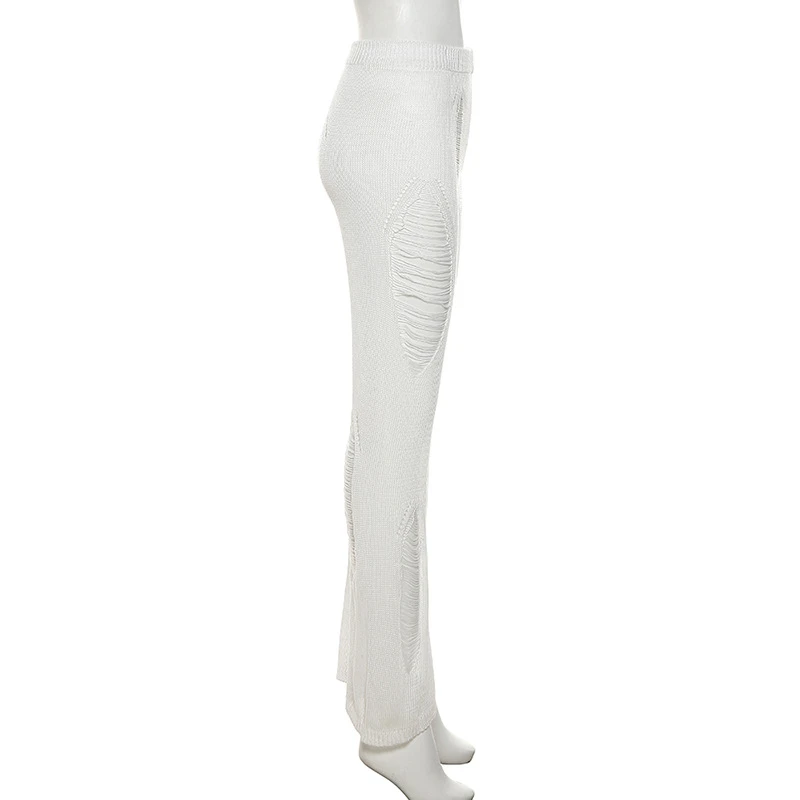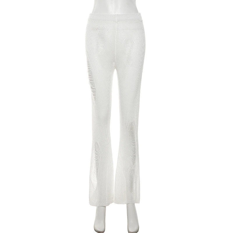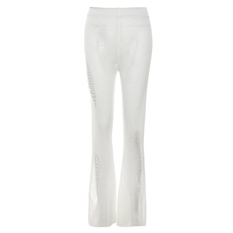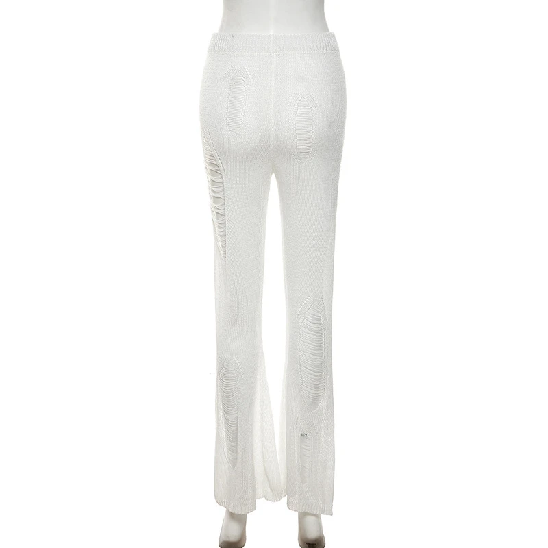 Adogirl Holes Hollow Out Knitted Two Piece Set Women Sexy See Through Long Sleeve Crop Top Elastic Flare Pants Clubwear Suits