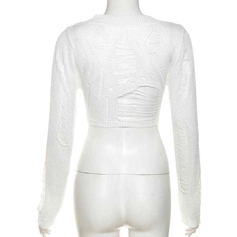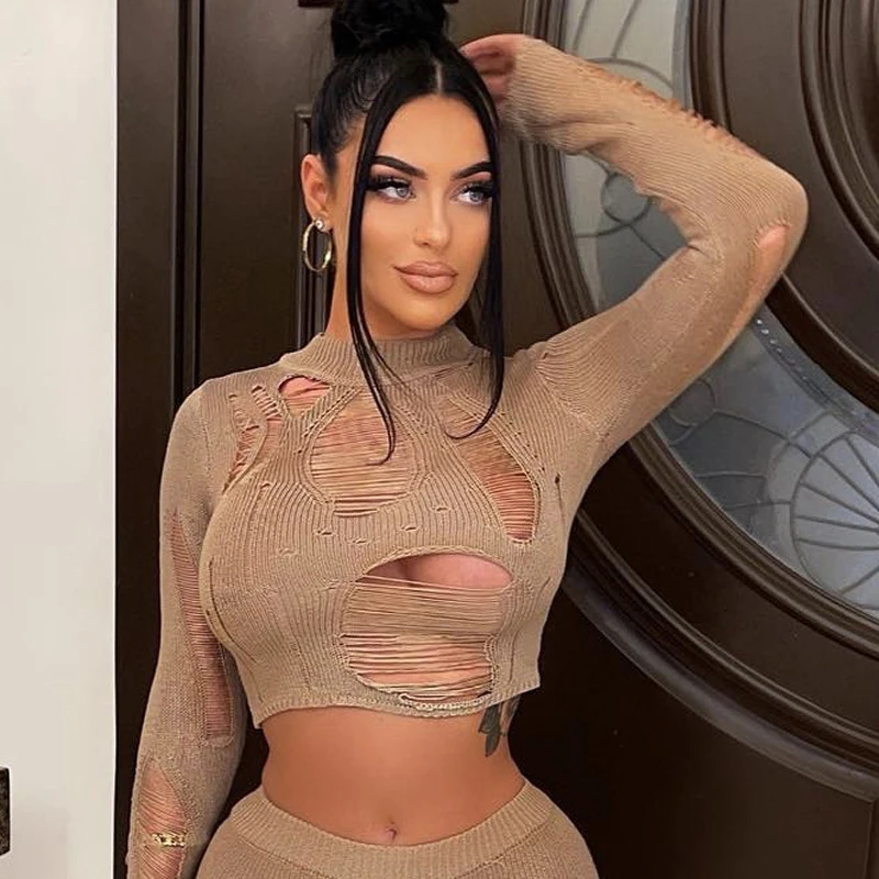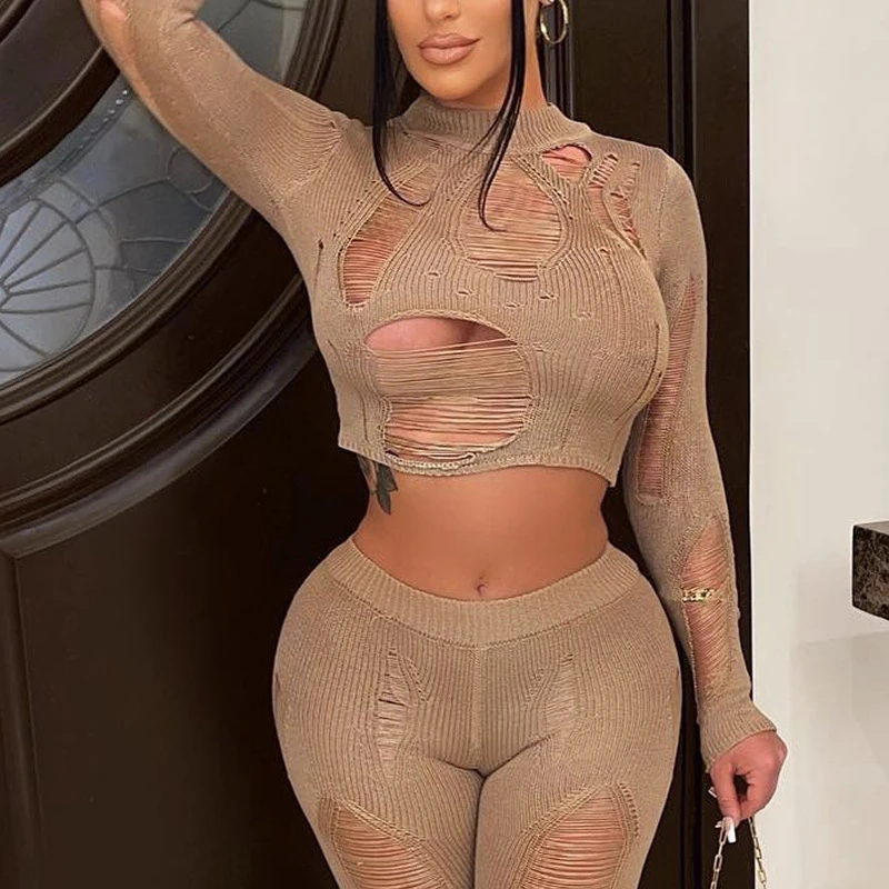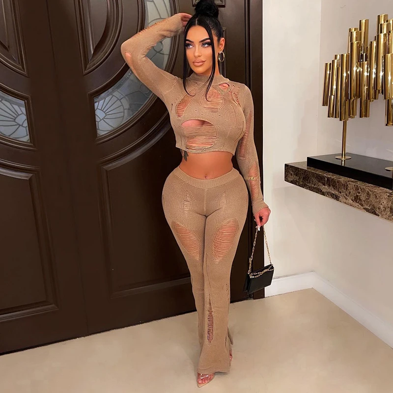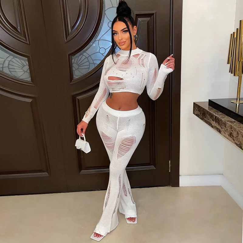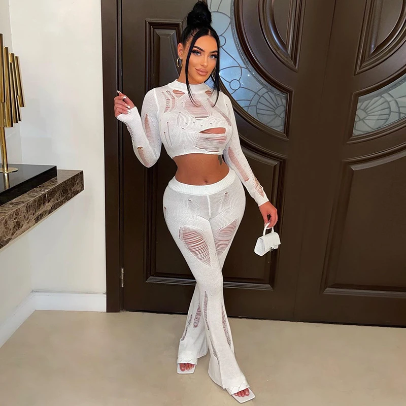Specification: Adogirl Holes Hollow Out Knitted Two Piece Set Women Sexy See Through Long Sleeve Crop Top Elastic Flare Pants Clubwear Suits