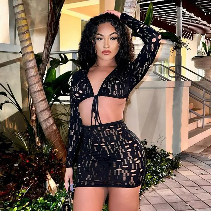 Adogirl Hollow Out Two Piece Set Dress Women Sexy Drawstring Lace Up Long Sleeve Crop Top Bodycon Mini Skirt Club Party Outfits