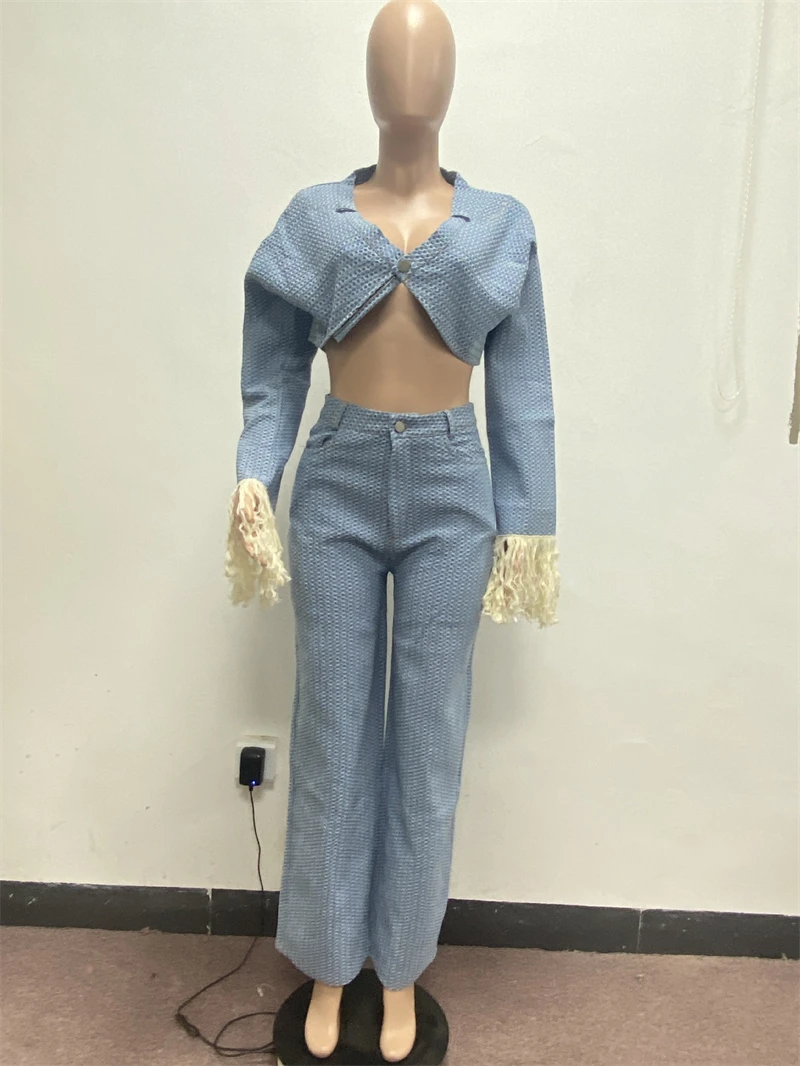 Specification: Adogirl Jeans 3 Piece Set Headscarf V Neck Tassel Long Sleeve Crop Top Wide Leg Pants Women Fashion Autumn Winter Denim Suits