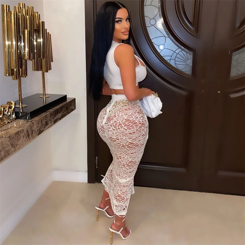 Adogirl Women Sexy Two Piece Set Dress Straps Vest Crop Top See Through Hollow Out Fishnet Mesh Maxi Skirt Clubweear Outfits
