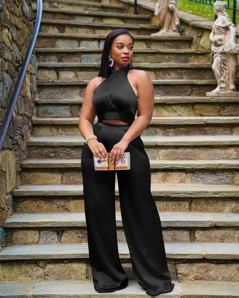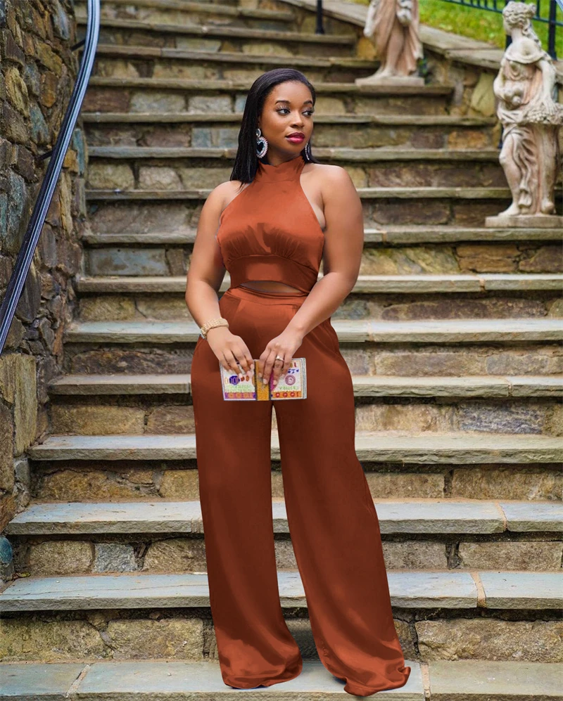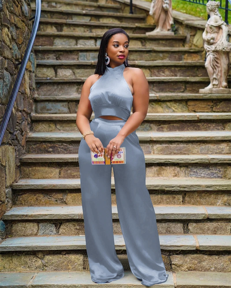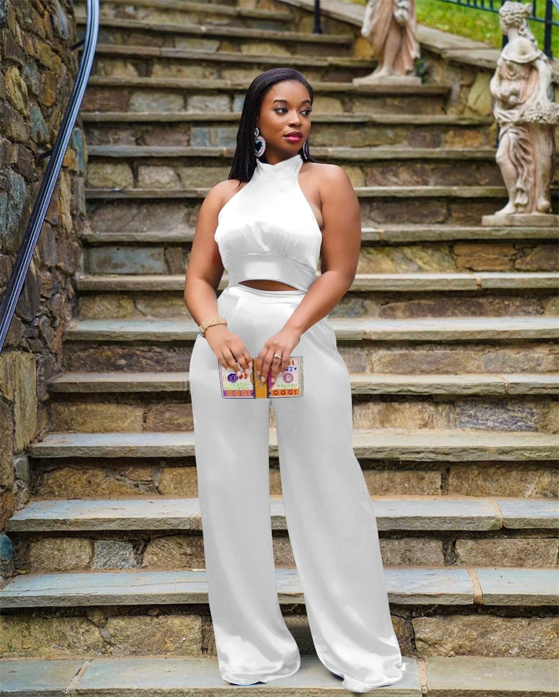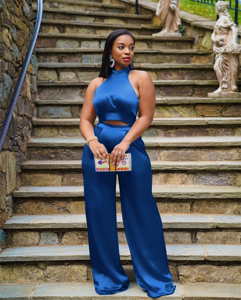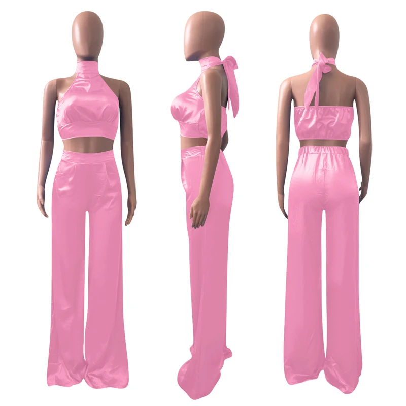Specification: Adogirl Women Solid Faux Silk Two Piece Set Lace Up Halter Backless Crop Top Wide Leg Pants Fashion Casual Business Work Suit