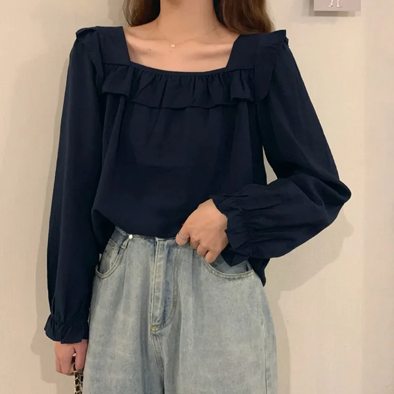 Features: square collar, temperament, long sleeves, shirt, female, scheming, niche, collarbone, top