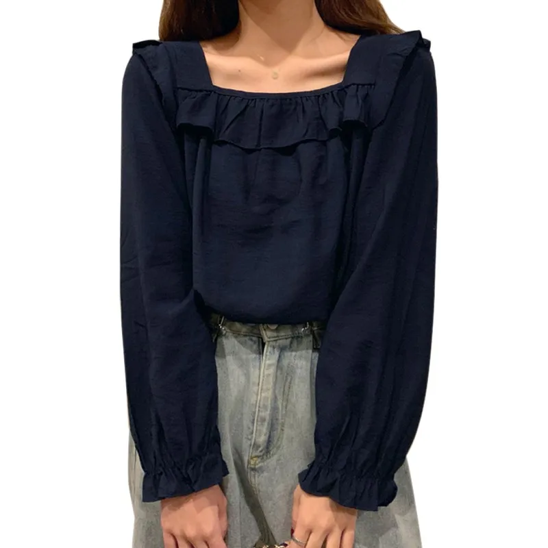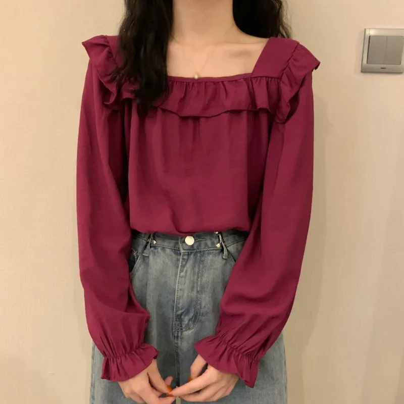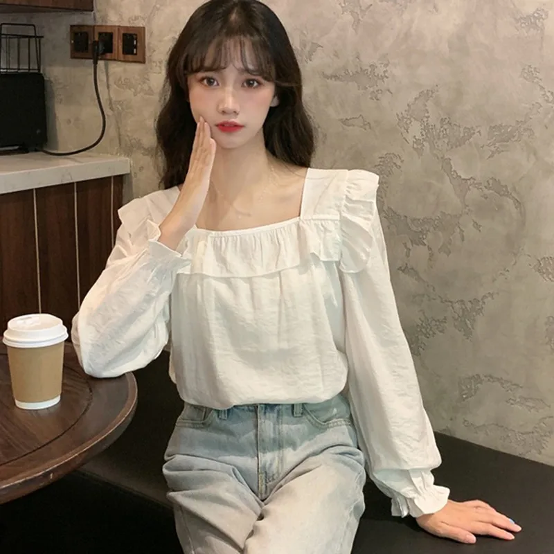 Specification: Autumn Women White Shirt Square Collar Long-sleeved Solid Color Petal Sleeve Thin Blouses Women Clothing