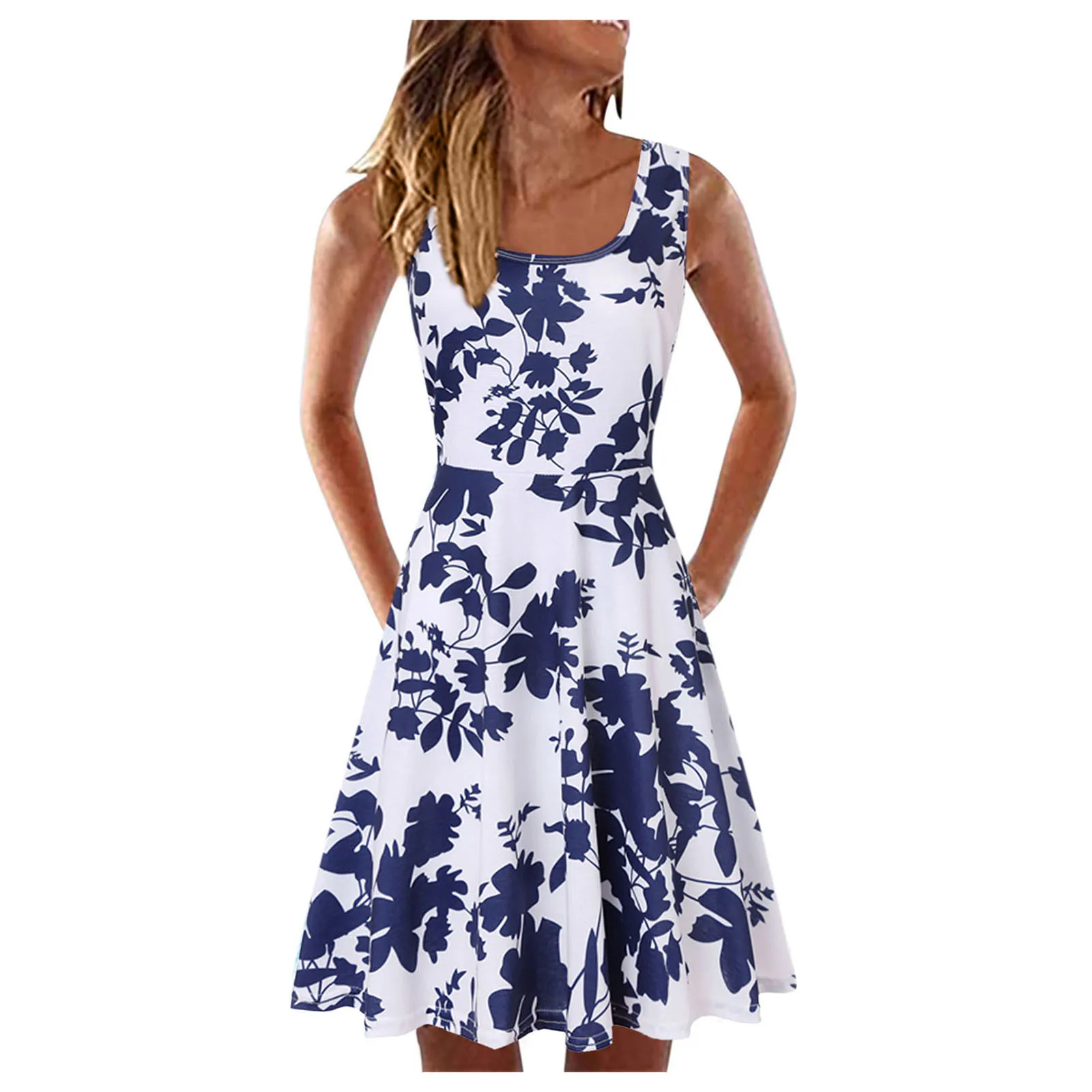 Backless Ladies Summer Dress Sexy Sleeveless U-Neck A-line Short Casual Sundress Floral Printed Loose Vintage Women Dresses