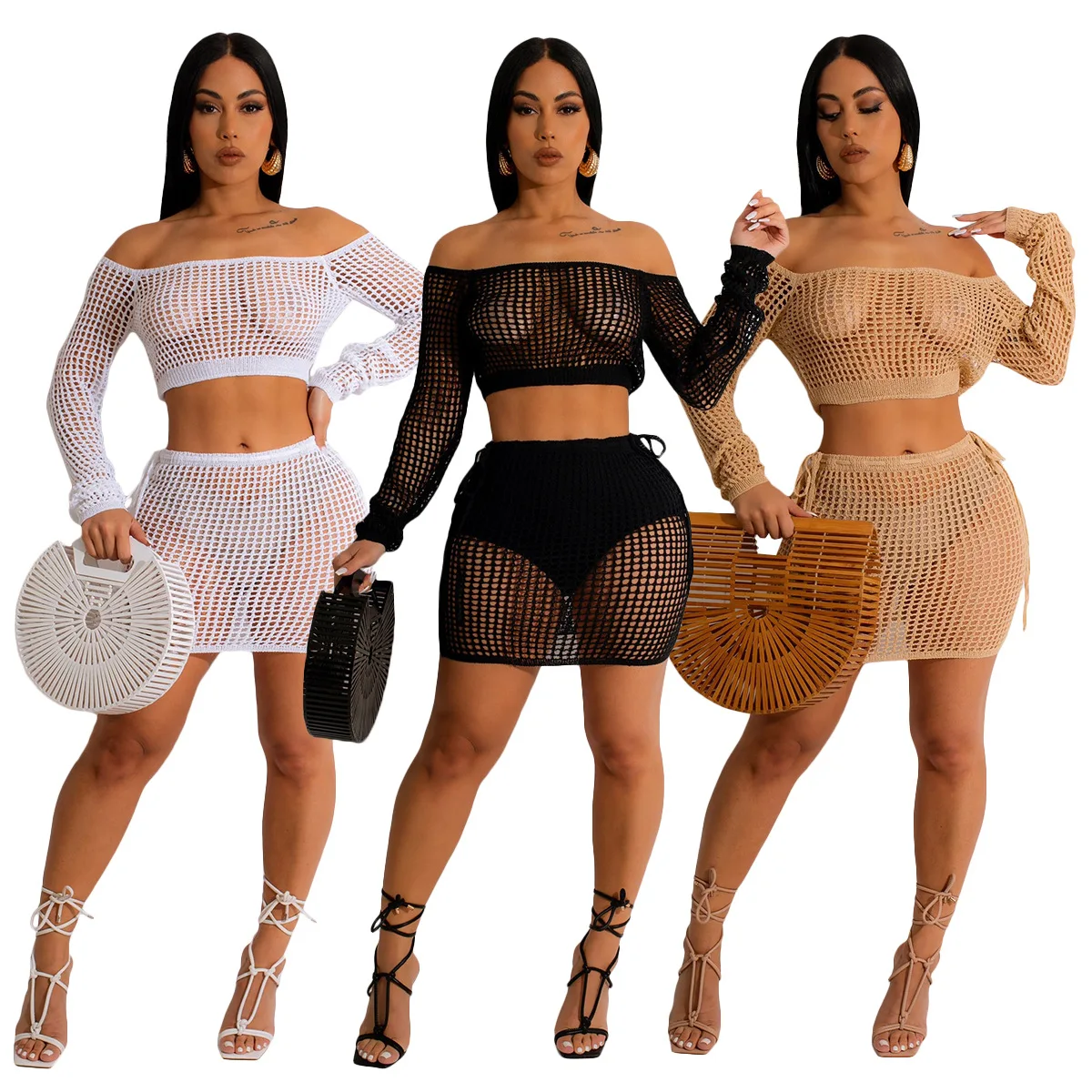 Casual Women Skirt Tracksuit Two Piece Set Slash Neck Dresses Set Hollow Out See Through Summer Beach Clothes Suit Outfit