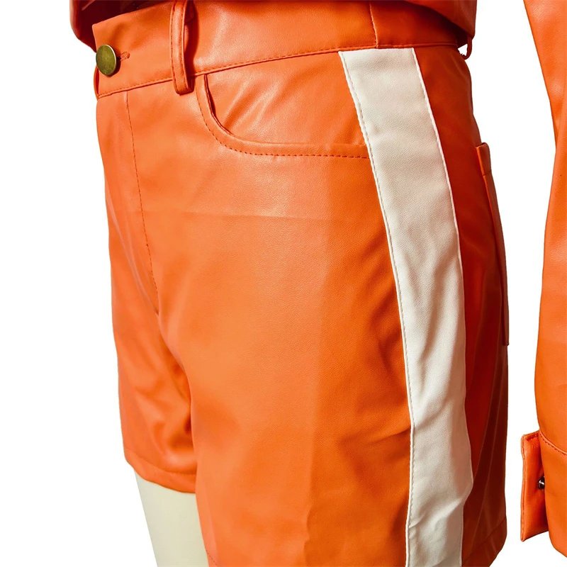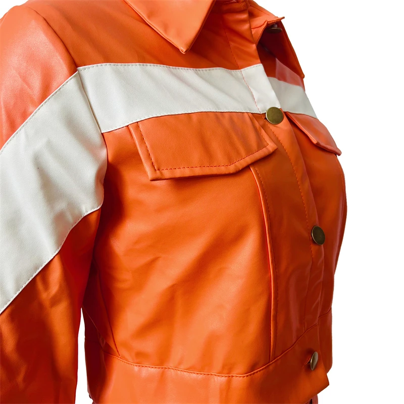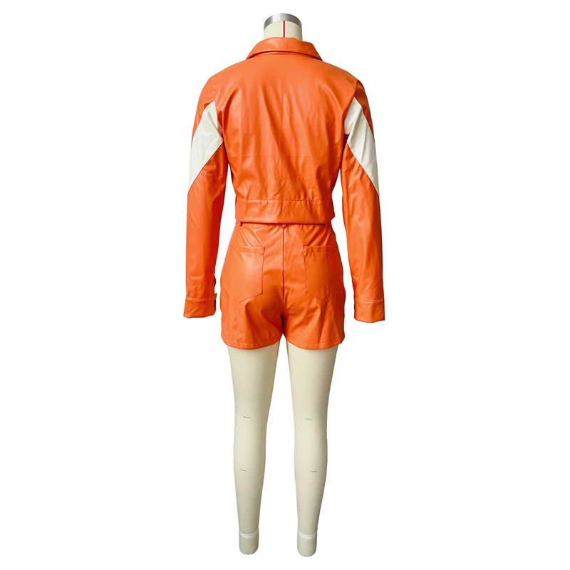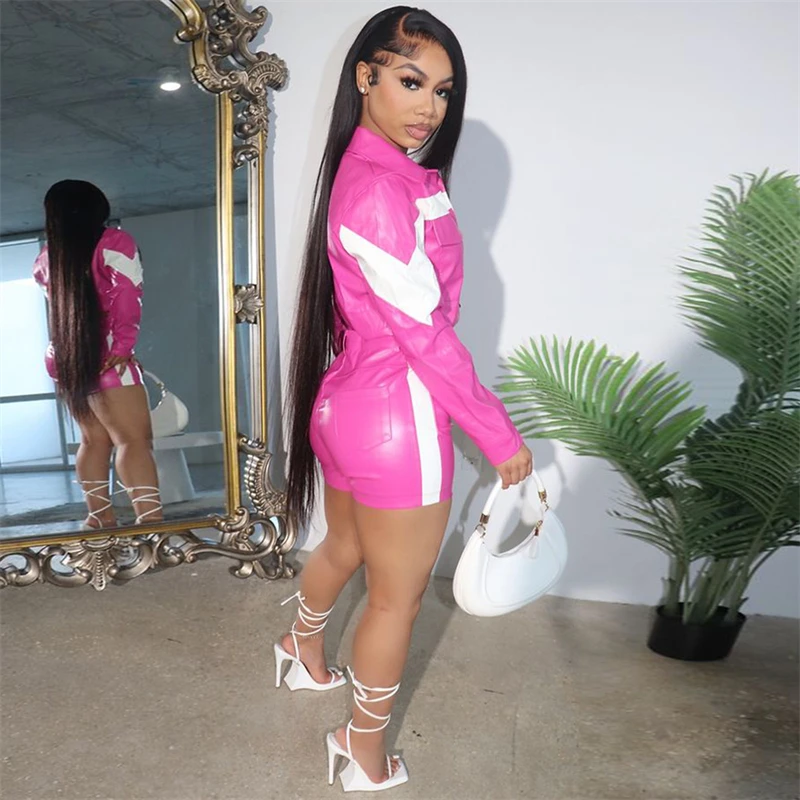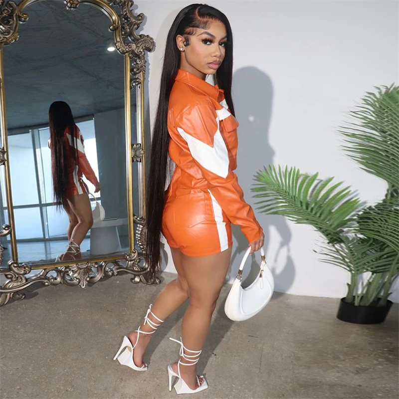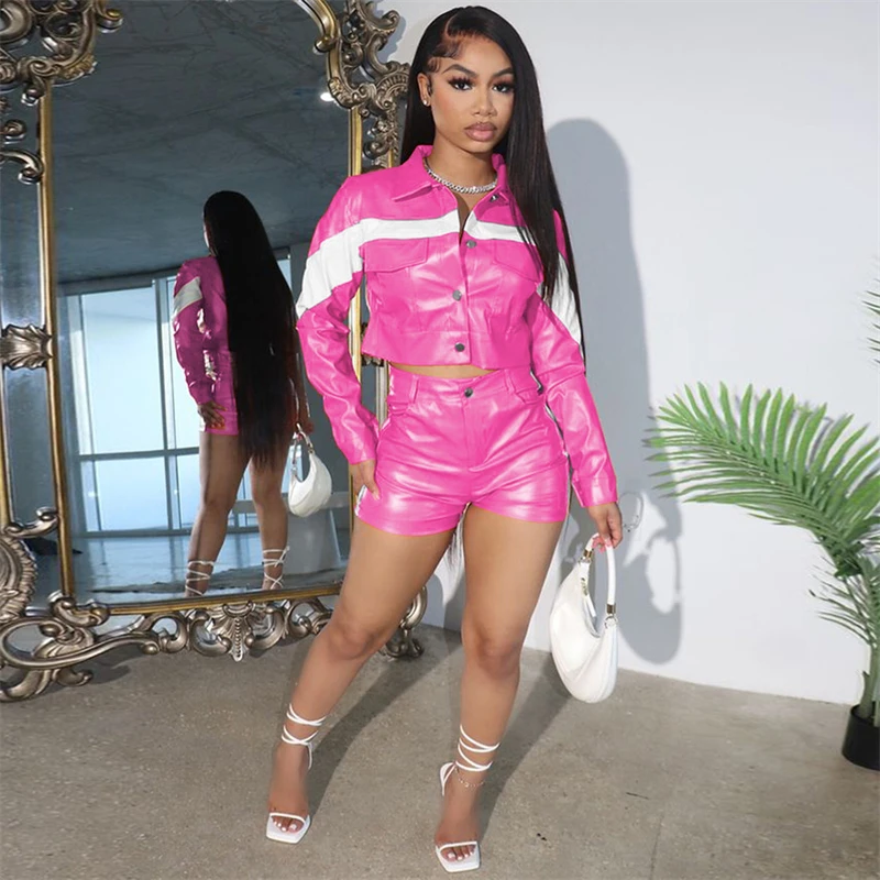 Specification: Echoine White Patchwork PU Leather Two Piece Set For Women Moto Biker Long Sleeve Jacket Top And Shorts Casual Suits