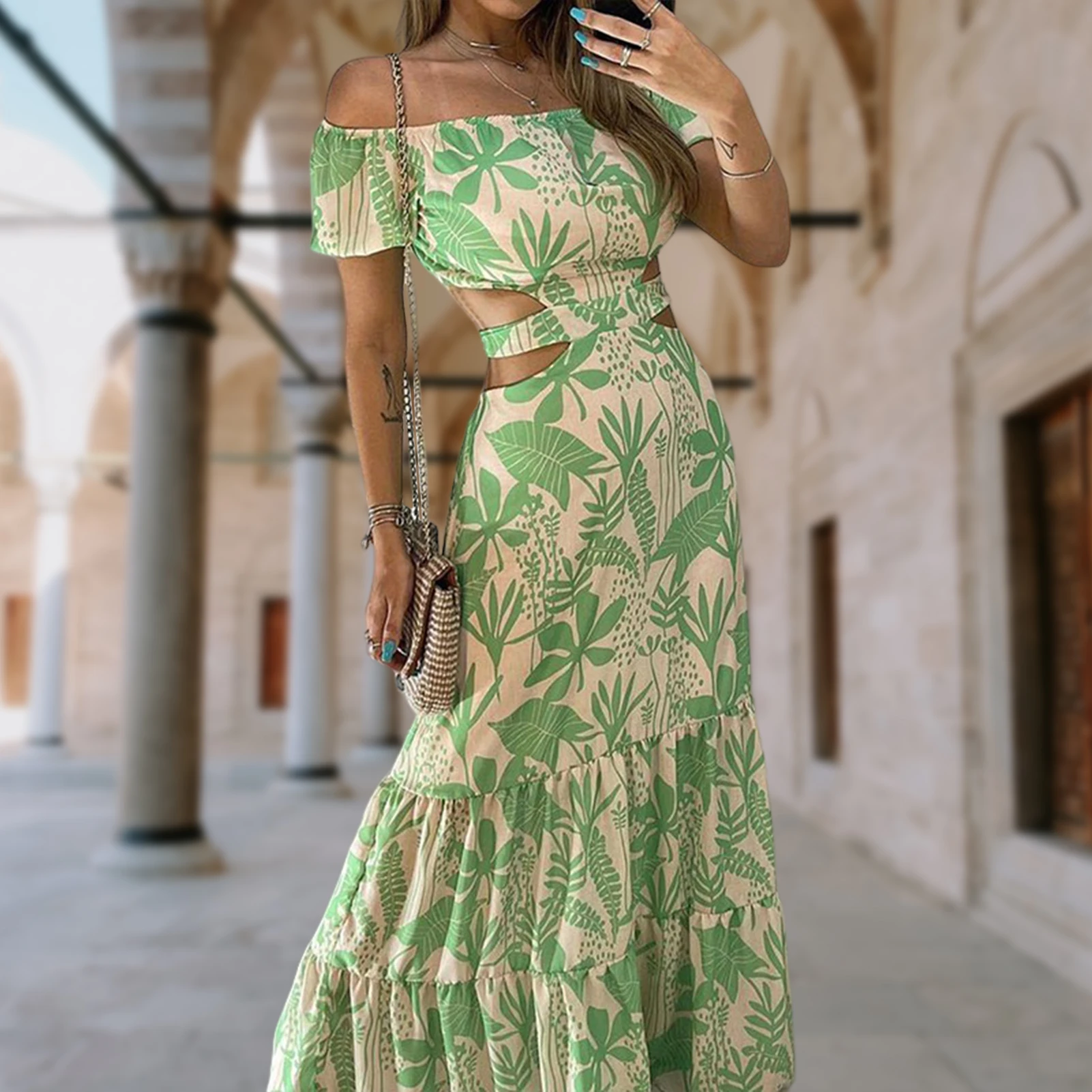 Specification: Elegant Commuter Female Dresses Sexy One Word Neck Backless Hollow Long Dress Fashion Printing Short Sleeve Lace-up Dresses