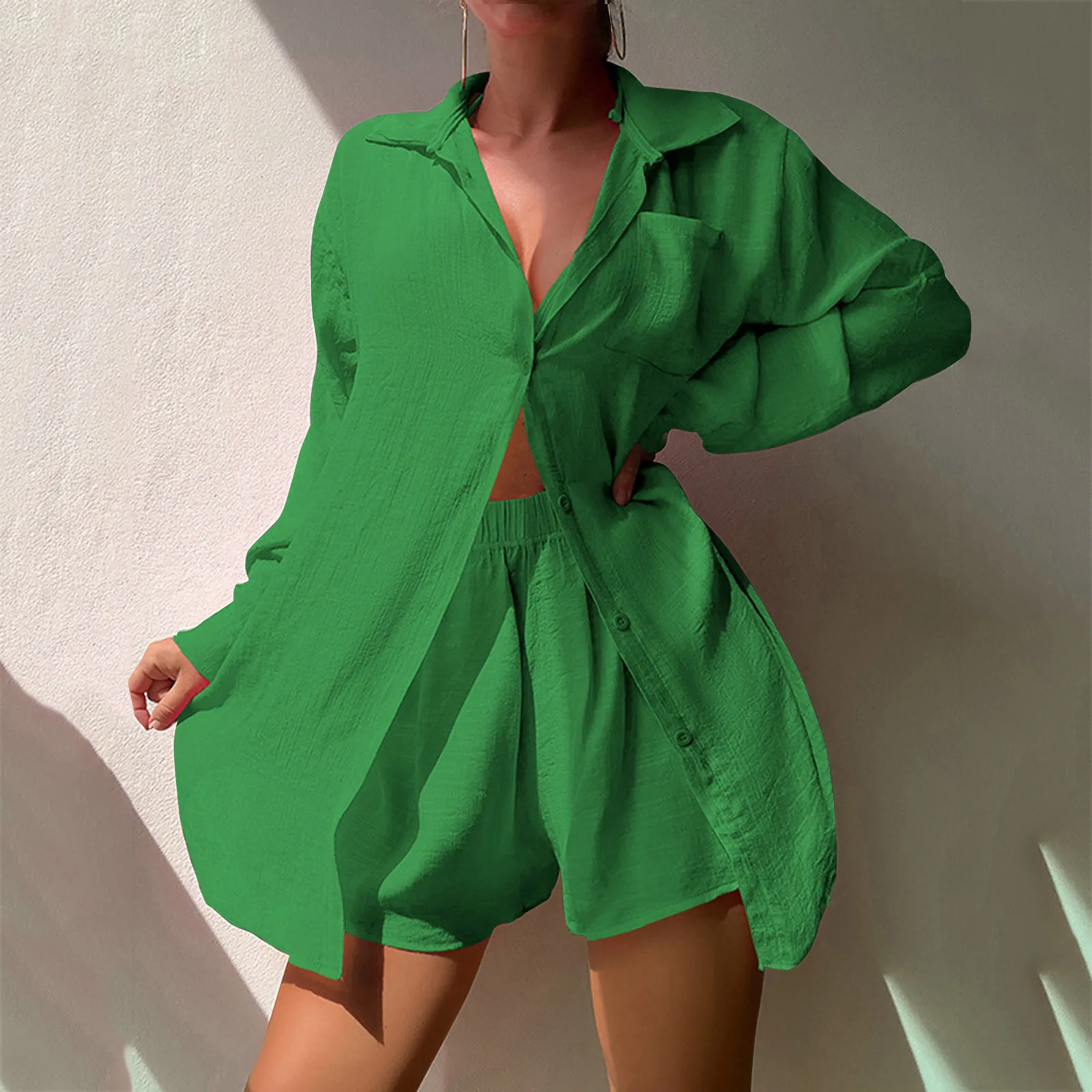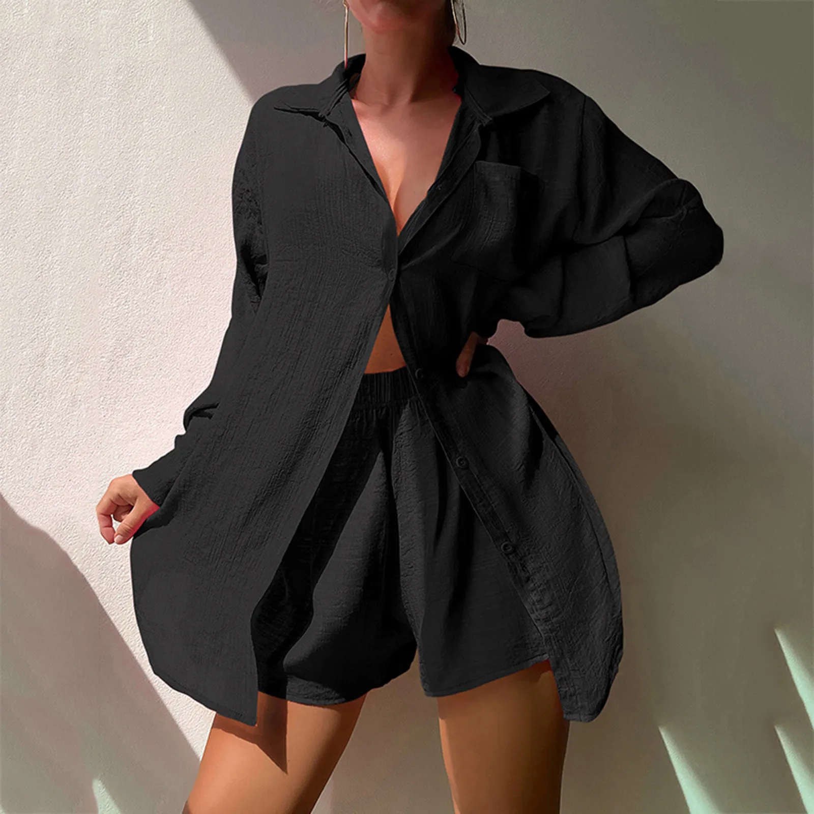 Fashion Long Sleeve Lapel Button Shirt and Shorts Sets Women Casual Solid 2 Piece Loose Beach Swimsuit Sun Protection Suits