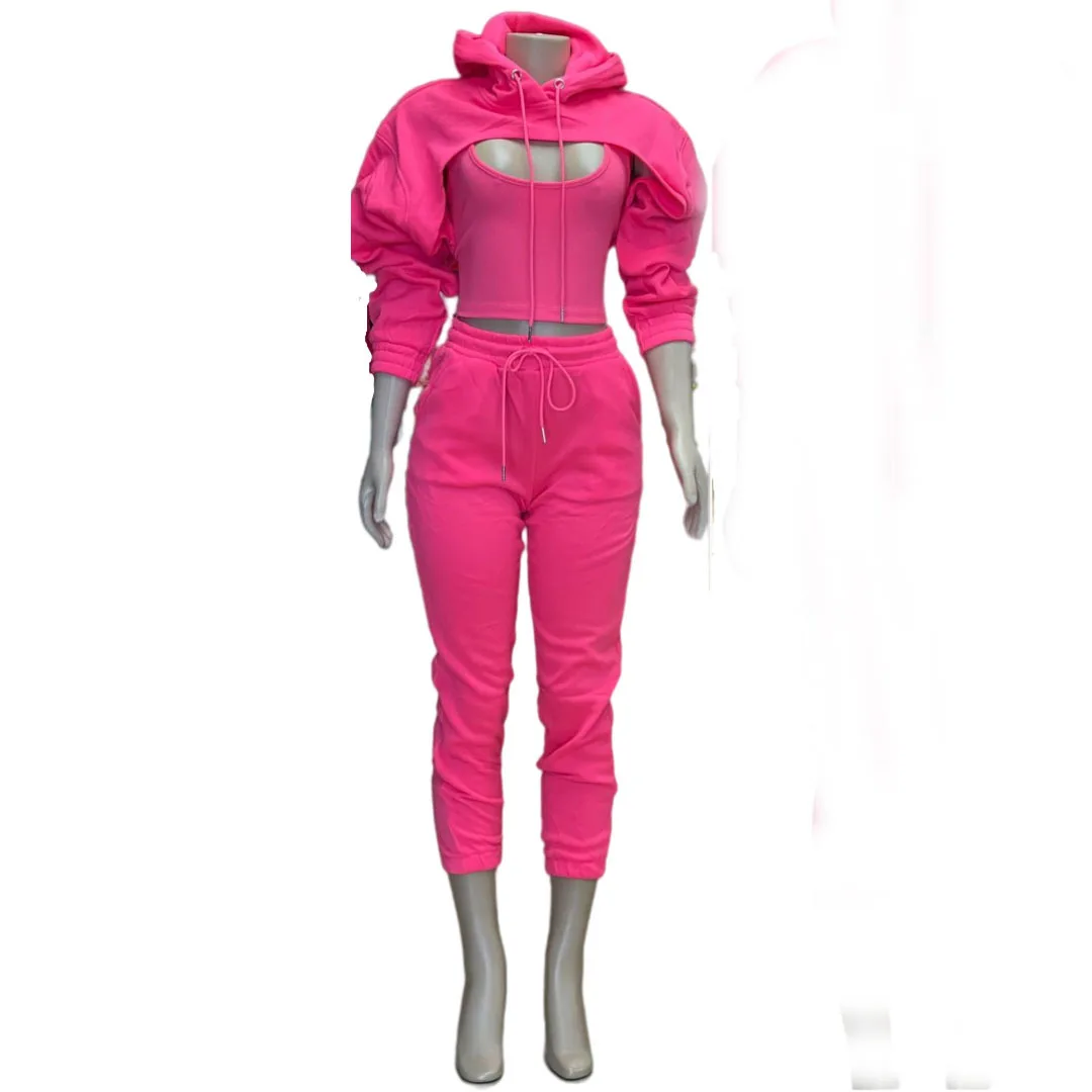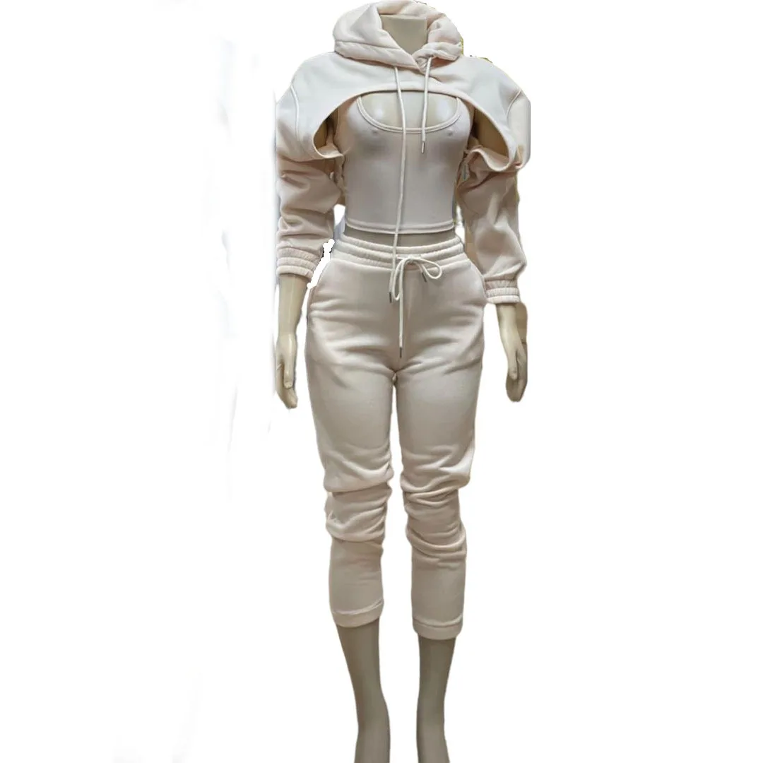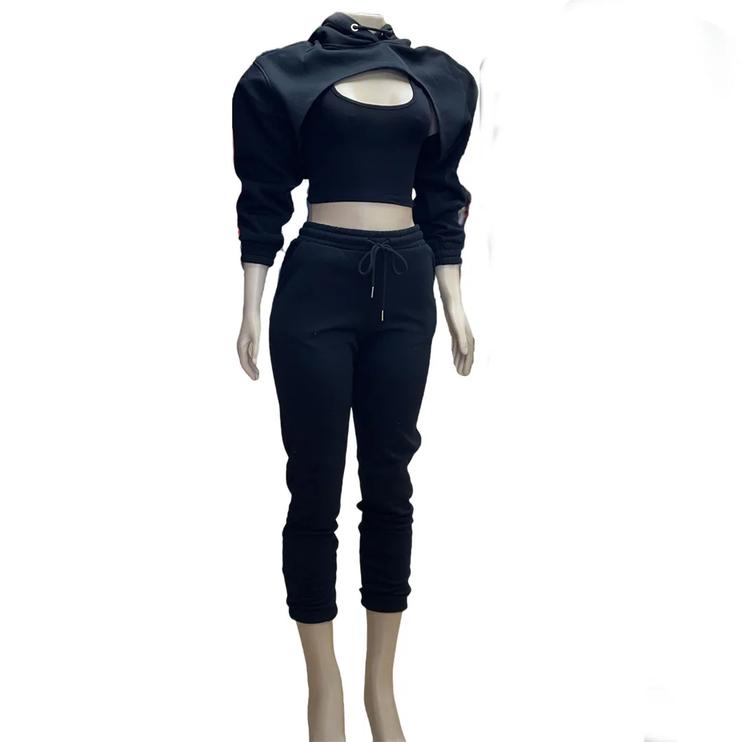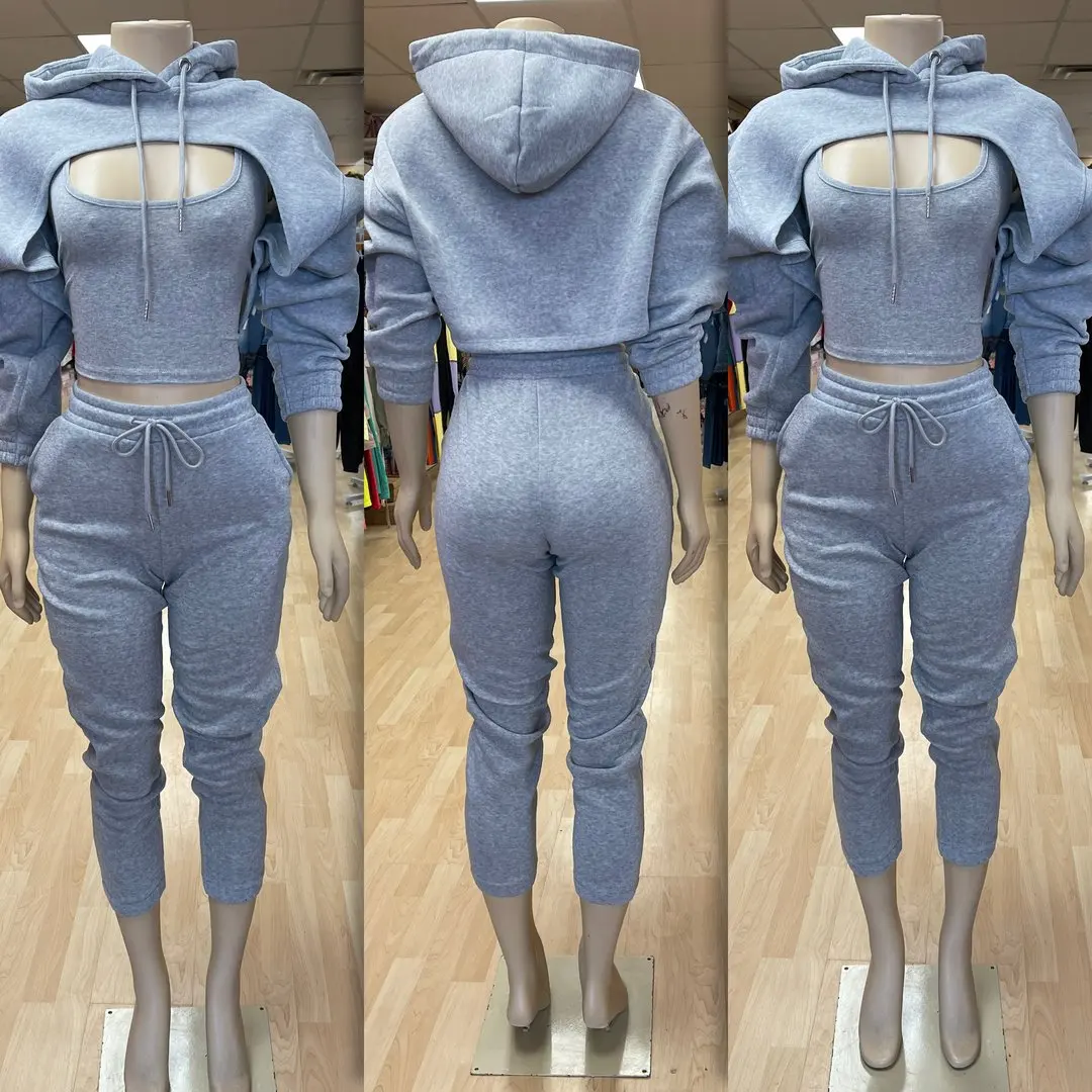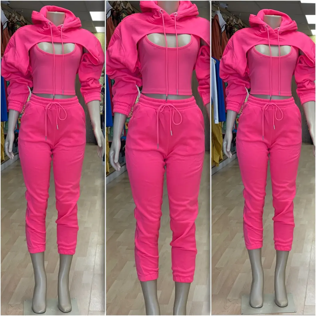 Specification: Fitness Women 3 Piece Set Solid Long Sleeve Crop Hoodies Vest High Waist Jogging Pants Suit 2021 Winter Autumn Sporty Sweat Suit