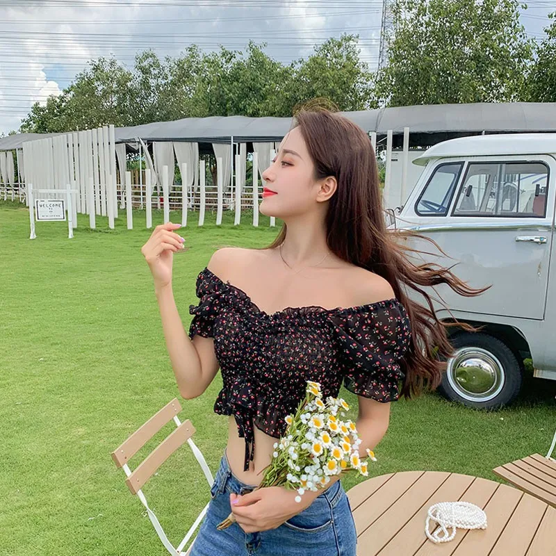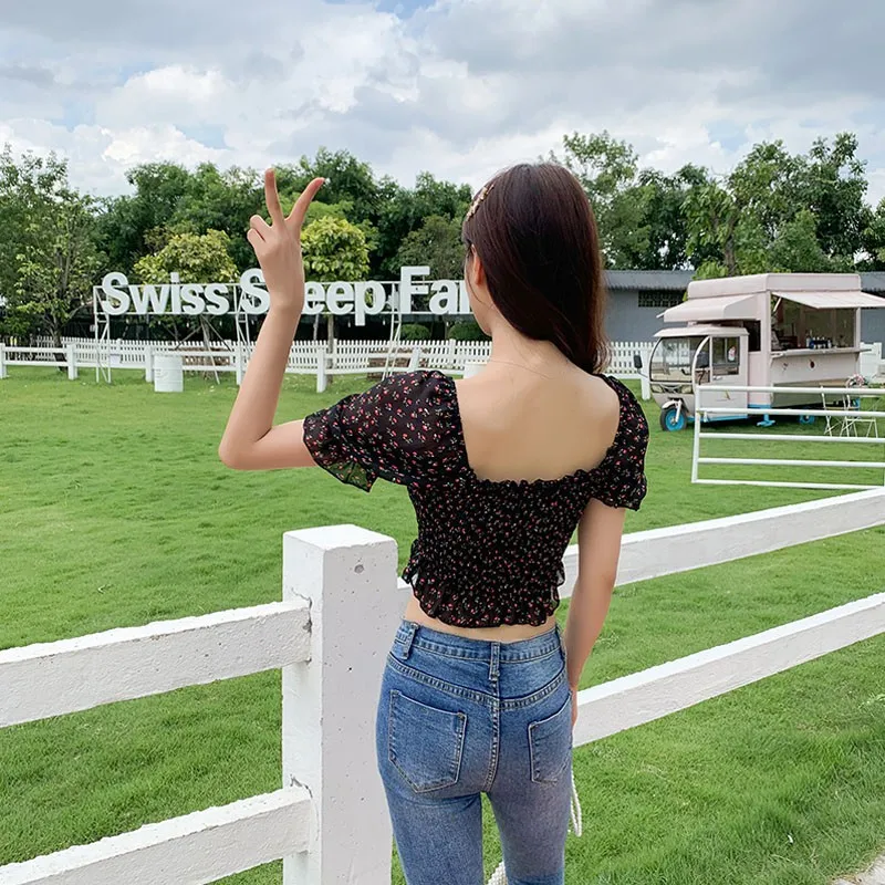 Specification: Floral Blouse Women Chiffon Tops and Blouses Summer Square Collar Sexy Sweet Pleated Short Shirts