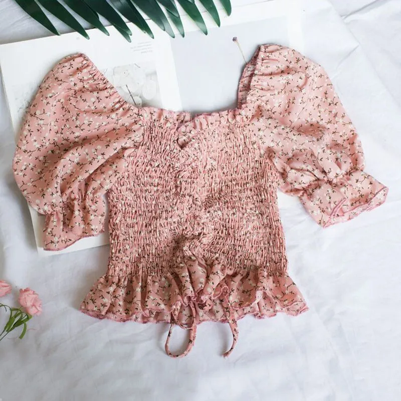 Floral Blouse Women Chiffon Tops and Blouses Summer Square Collar Sexy Sweet Pleated Short Shirts
