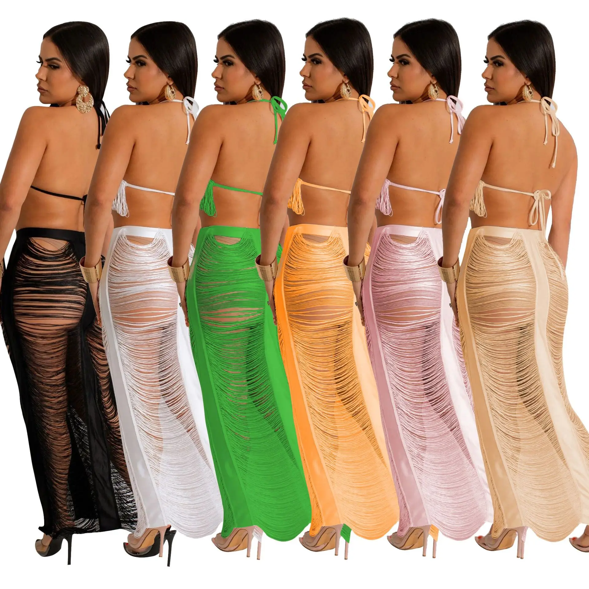 Specification: Hollow Out Tassel Knitted 2 Piece Set Women Sexy Lace Up Bra Top Patchwork Maxi Skirts Summer Vacation Beach Dress Suits