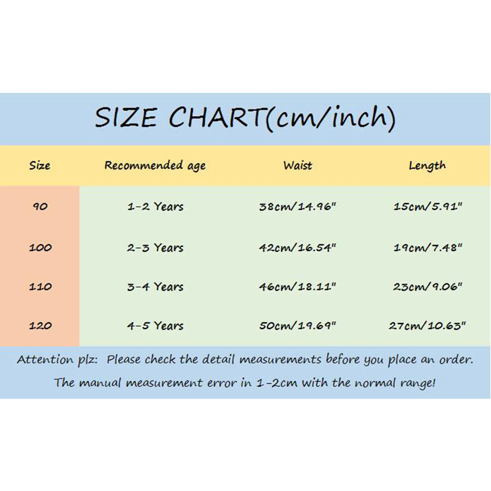 | Size:110 | Recommended age:3-4 Years | Waist:46cm/18.11” | Length:23cm/9.06” |