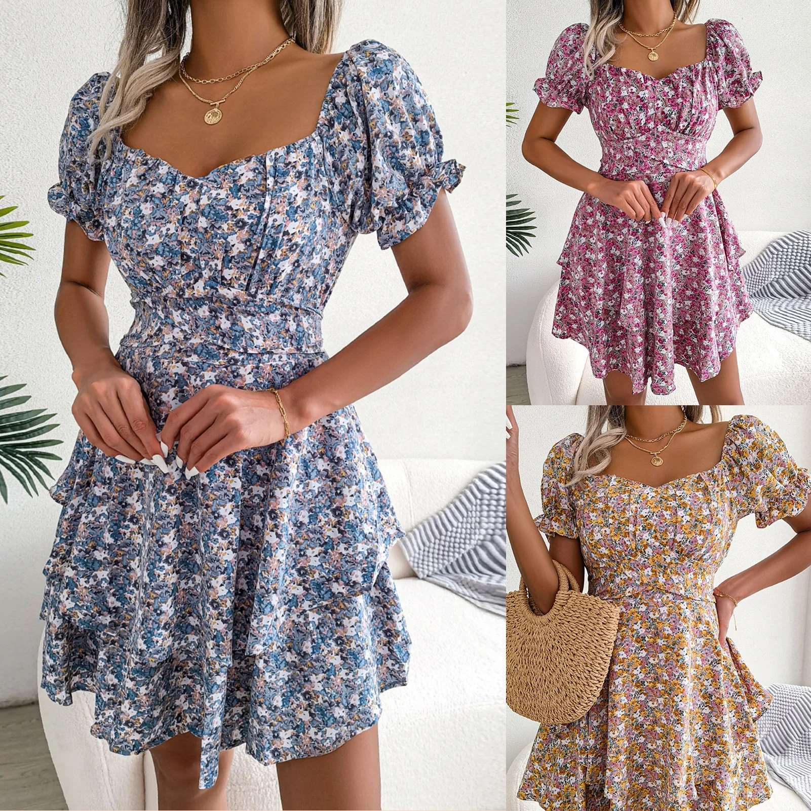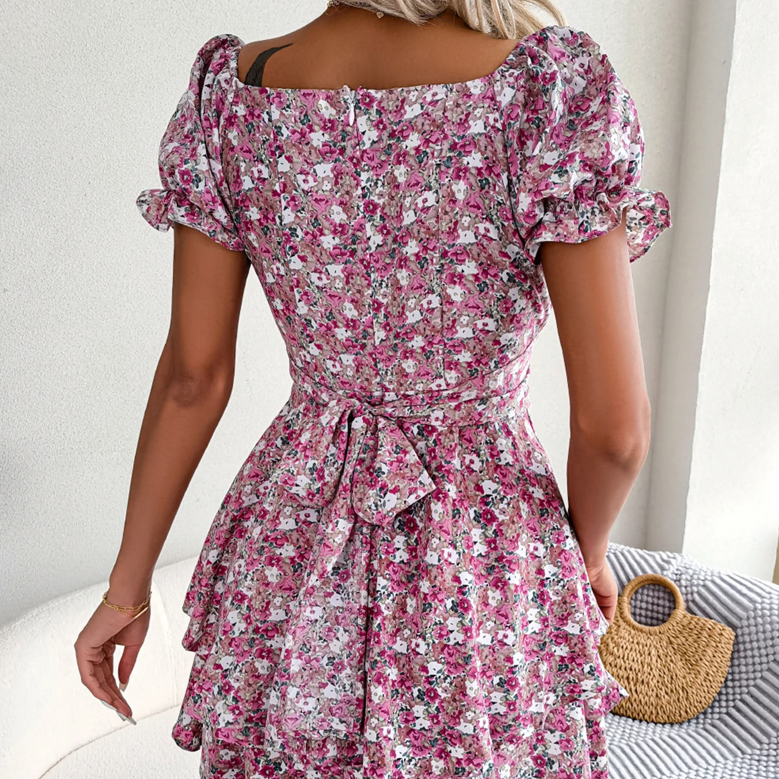 Women Printing Dress Lace-up Female Beach Mini Dress Waist Up Floral Dress Puff Sleeve Women Daily Wear Summer Clothes Set
