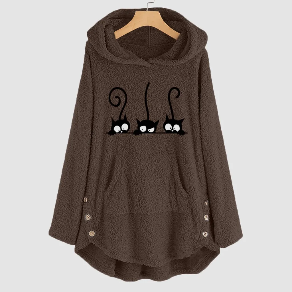 Oversize Hoodie Womens Fleece Teddy Hoodies Cat Print Warm Hooded Pullover Top Sweatshirts Jumper Women Hoodie Sweatshirts 2023