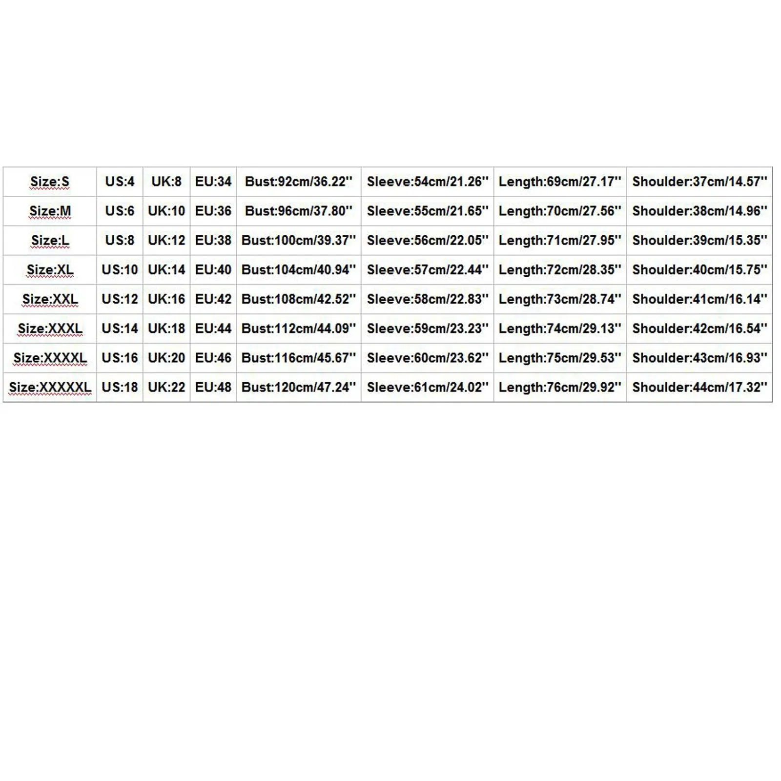 Size US UK EU Bust Sleeve Length Shoulder S 4 8 34 92cm/36.22” 54cm/21.26” 69cm/27.17” 37cm/14.57” M 6 10 36 96cm/37.80” 55cm/21.65” 70cm/27.56” 38cm/14.96” L 8 12 38 100cm/39.37” 56cm/22.05” 71cm/27.95” 39cm/15.35” XL 10 14 40 104cm/40.94” 57cm/22.44” 72cm/28.35” 40cm/15.75” XXL 12 16 42 108cm/42.52” 58cm/22.83” 73cm/28.74” 41cm/16.14” XXXL 14 18 44 112cm/44.09” 59cm/23.23” 74cm/29.13” 42cm/16.54” XXXXL 16 20 46 116cm/45.67” 60cm/23.62” 75cm/29.53” 43cm/16.93” XXXXXL 18 22 48 120cm/47.24” 61cm/24.02” 76cm/29.92” 44cm/17.32”