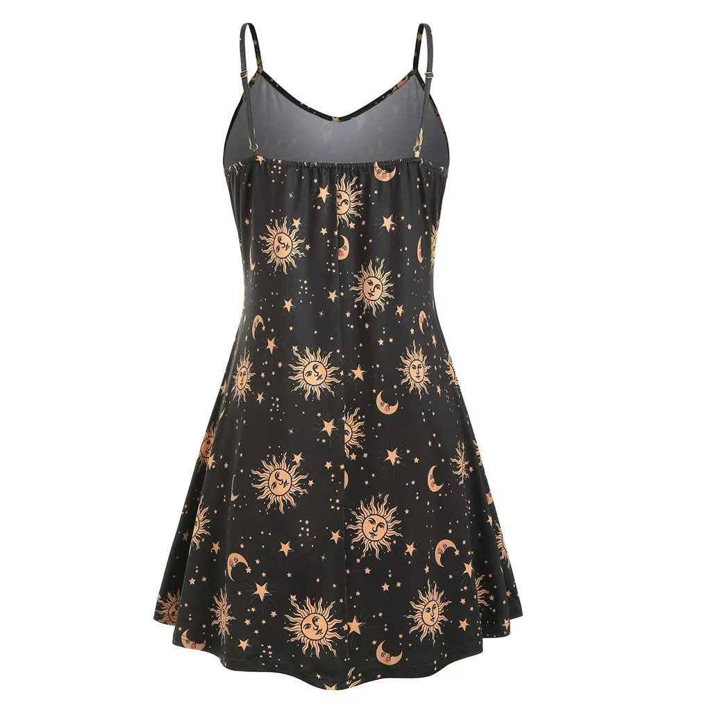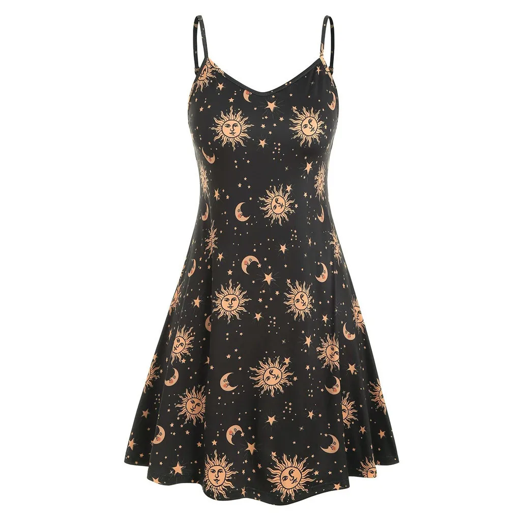 Specification: Plus Size Dresses for Women Gothic Sun Moon Print Spaghetti Strap Dress Girls Sleeveless Boho Beach Party Dress Sundress 5XL