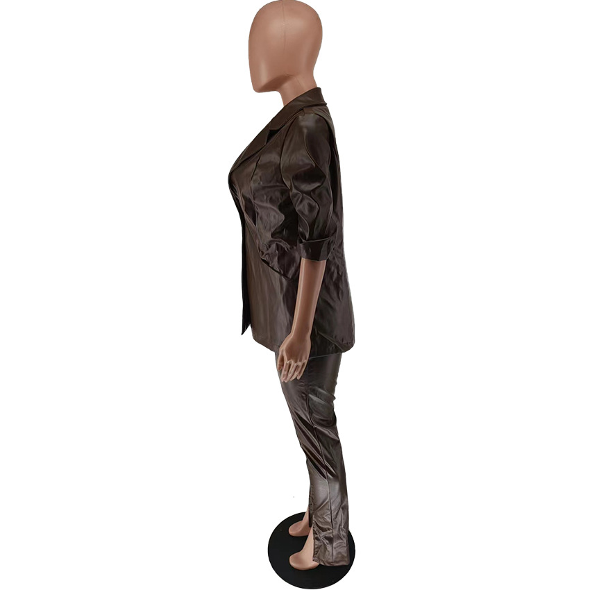 1 review for PU Leather Office Lady Women 2 Piece Set Notch Neck Blazer High Waist Pants Matching Set 2022 Autumn Work Wear Slim Tracksuits