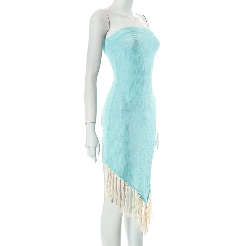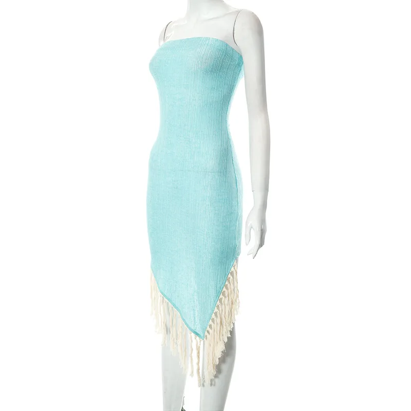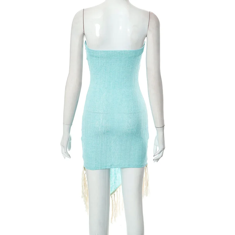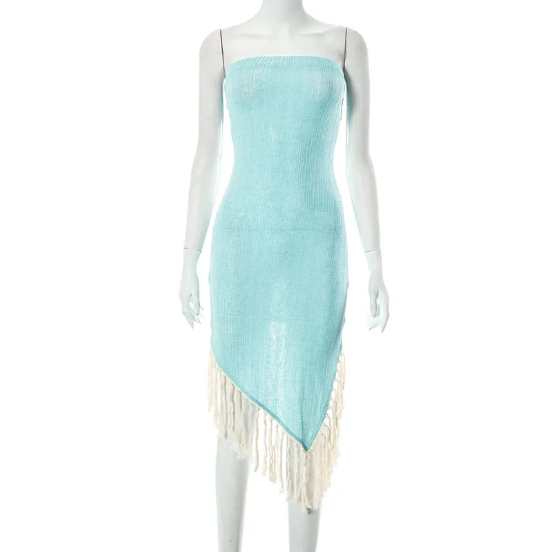 Rib Knitted Tassel Strapless Asymmetrical Dress Women Sexy Chest Wrapping Sleeveless Backless Stretch Bodycon Party Outfits Robe