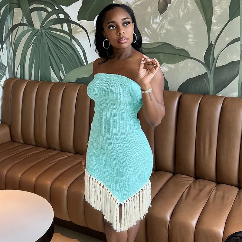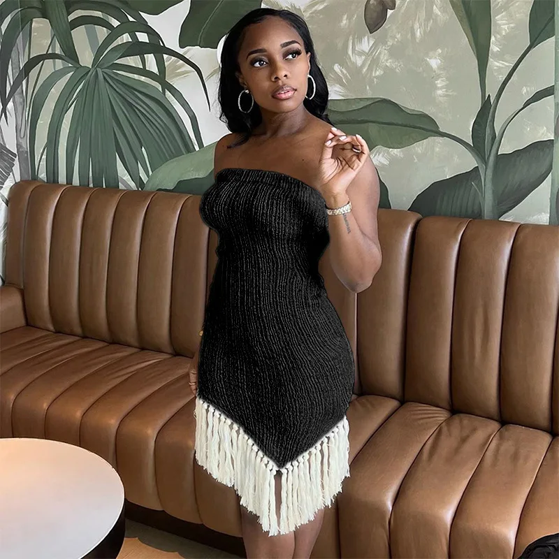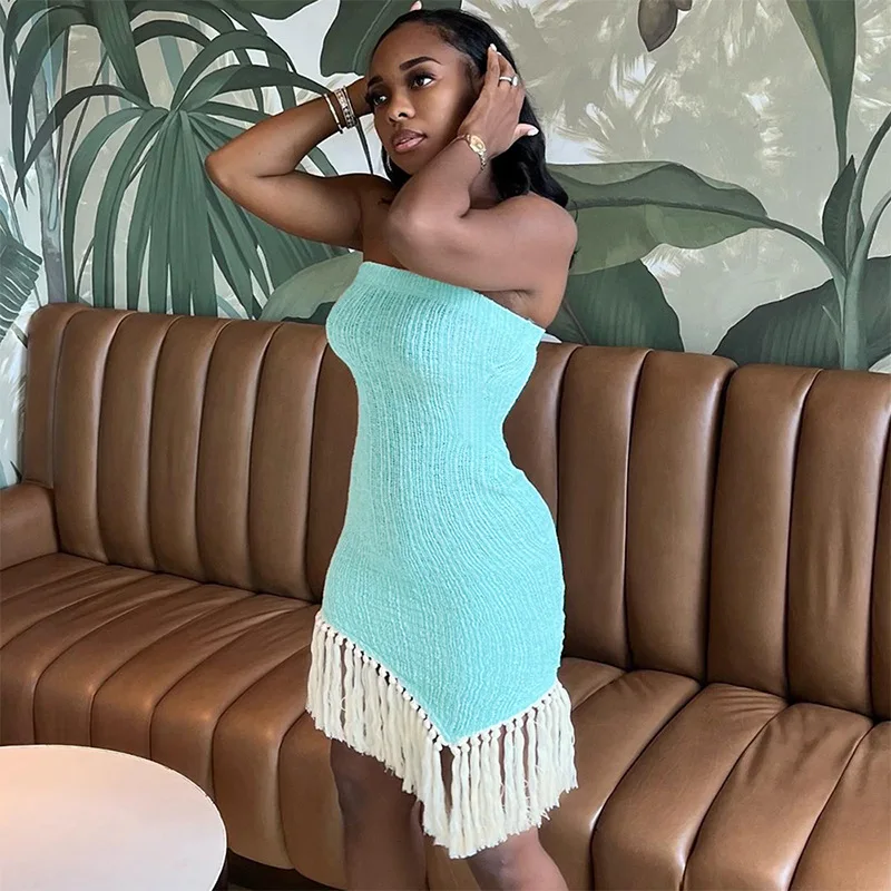 Specification: Rib Knitted Tassel Strapless Asymmetrical Dress Women Sexy Chest Wrapping Sleeveless Backless Stretch Bodycon Party Outfits Robe
