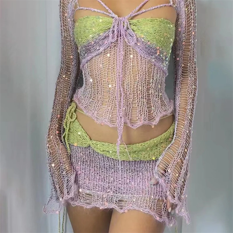 Specification: Sequins Knitted 3 Piece Sets Women Sexy Long Flare Sleeve Cape Lace Up Strapless Crop Tops Bodycon Mini Skirts Sexy Club Suits