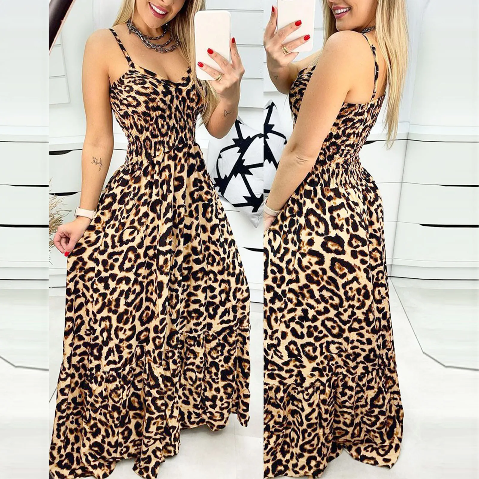 Sexy Elastic High Waist Maxi Dress Women Summer Leopard Printed Backless Long Dress Slim Spaghetti Strap Beach Dresses robe