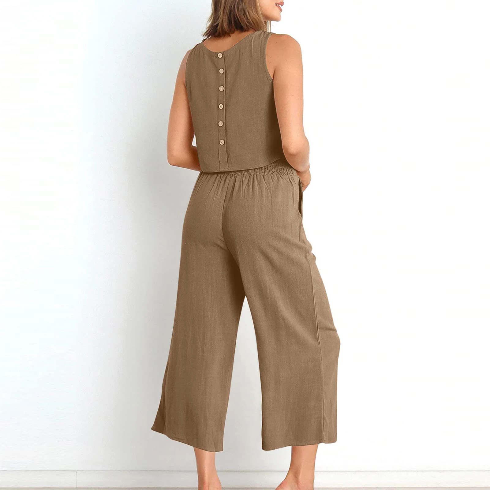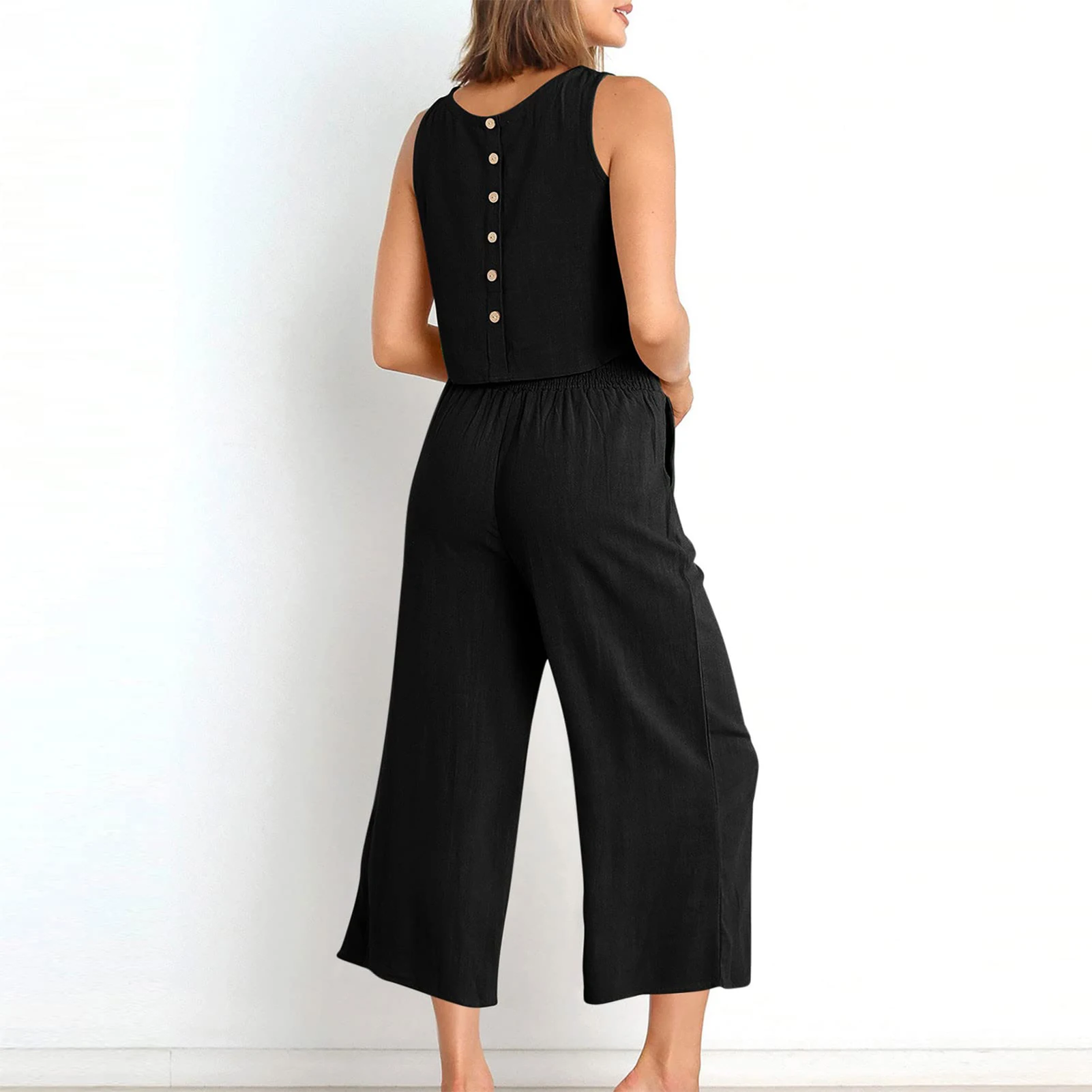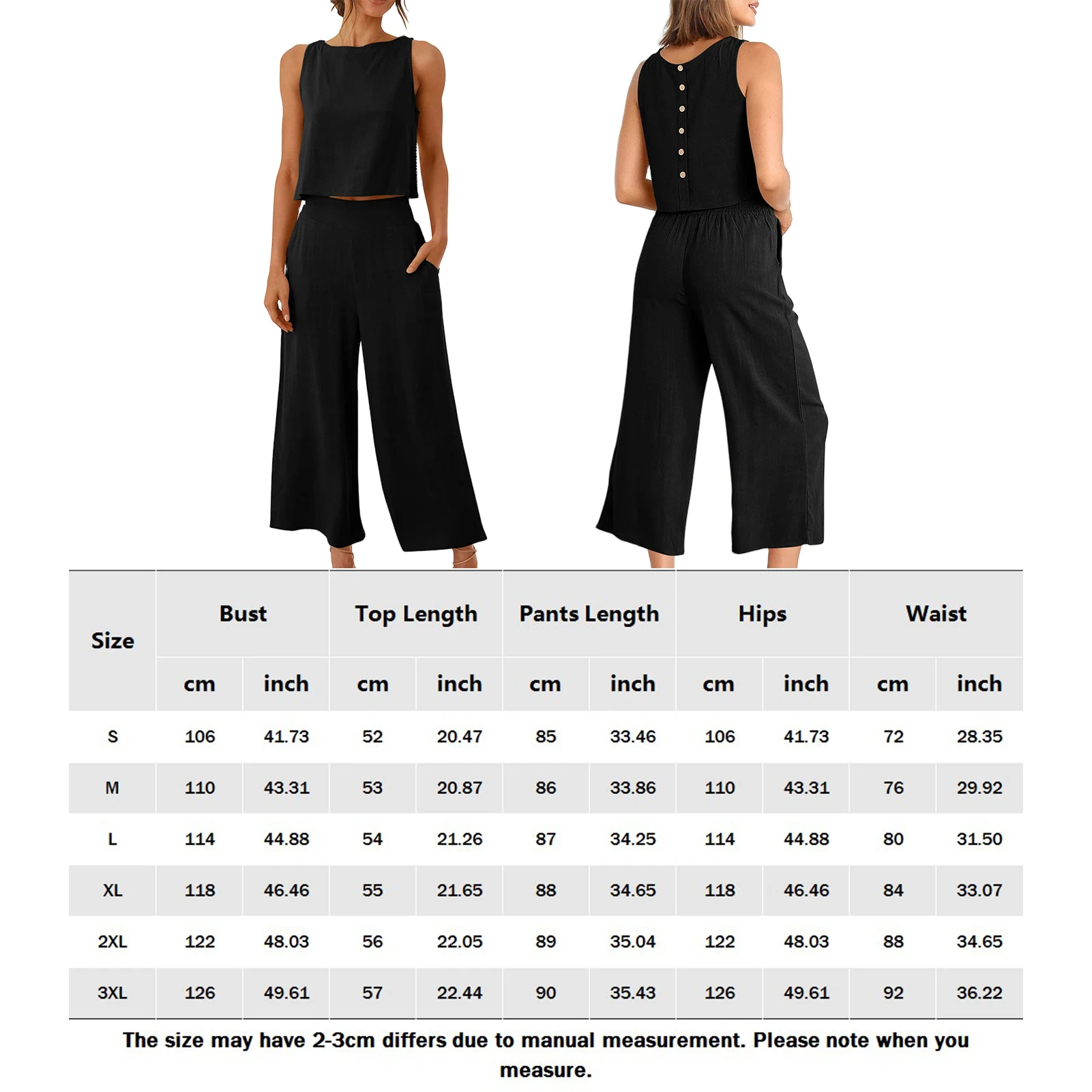 Specification: Sleeveless O-neck Tank Top and Wide Leg Pants Suit Women Casual Solid Button 2-piece Set Ladies Fashion Loose Pocket Office Sets