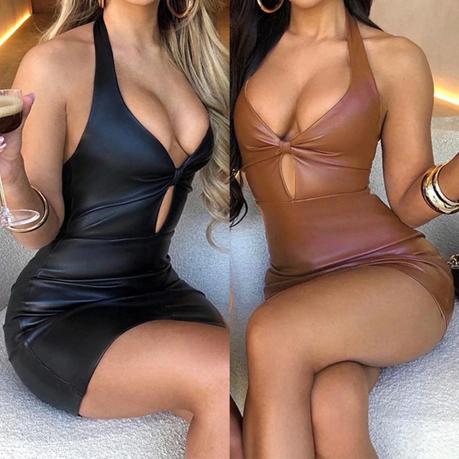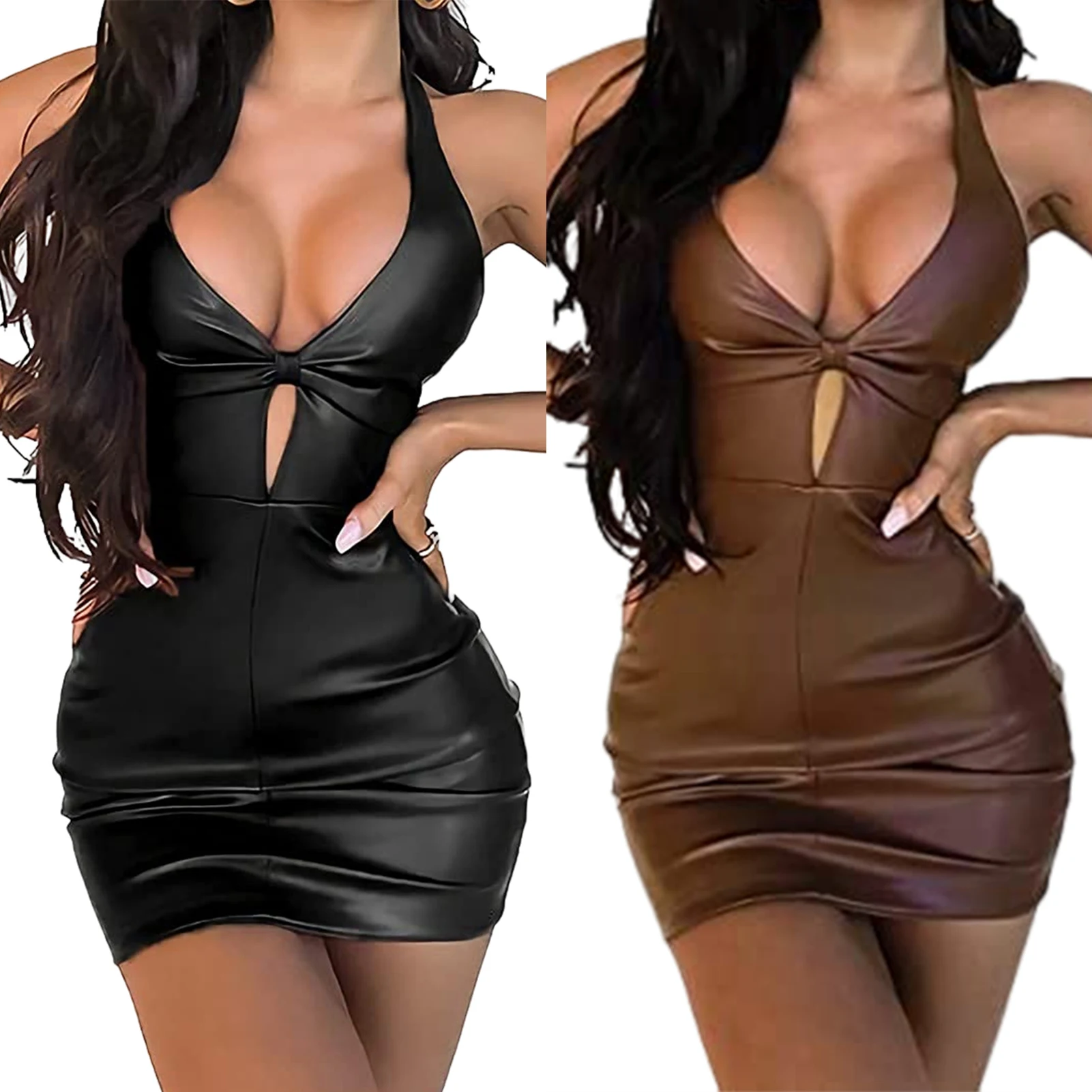 Sleeveless Slim Dress Soft Comfortable Low Cut Leather Dress Fashion Style Mini Bodycon Hot Dress for Party for Night Club