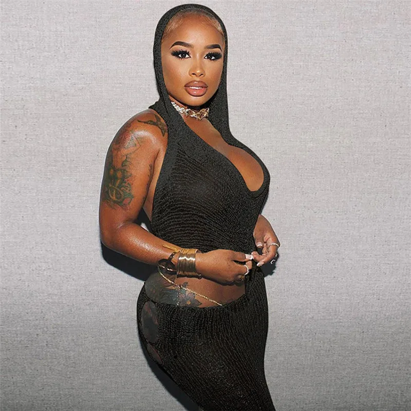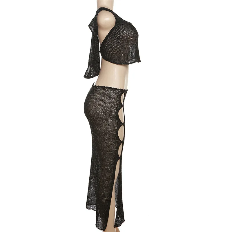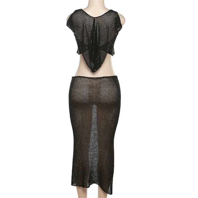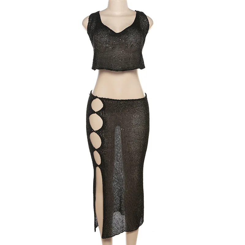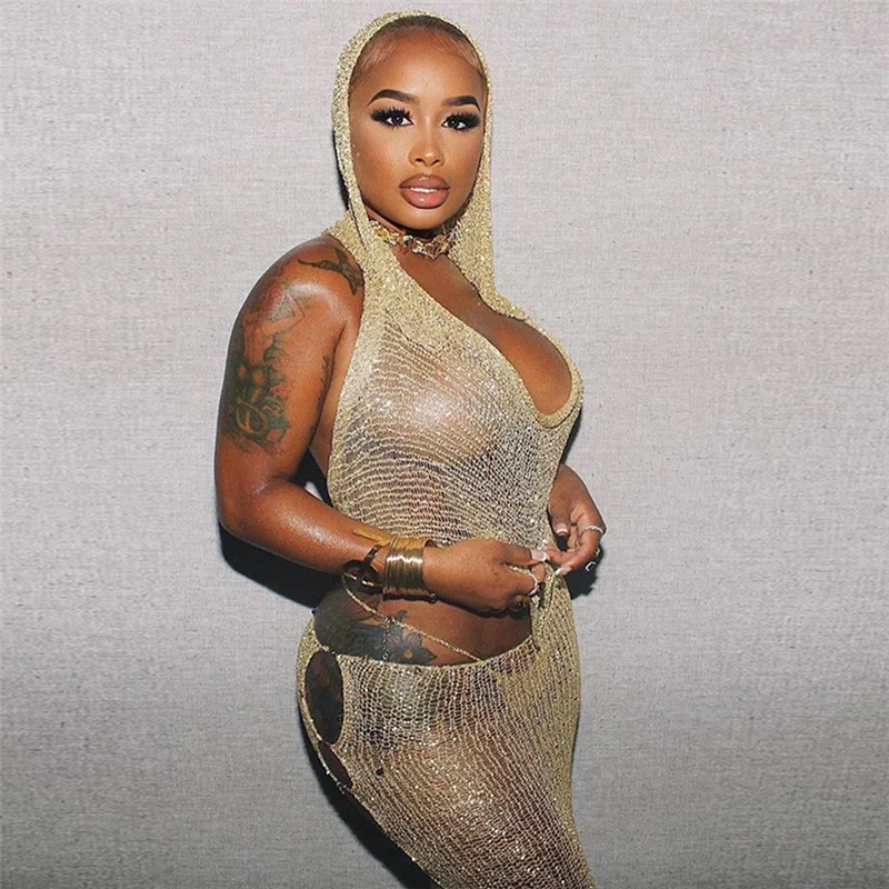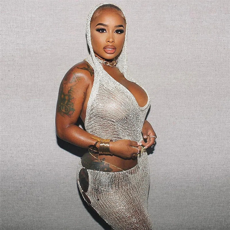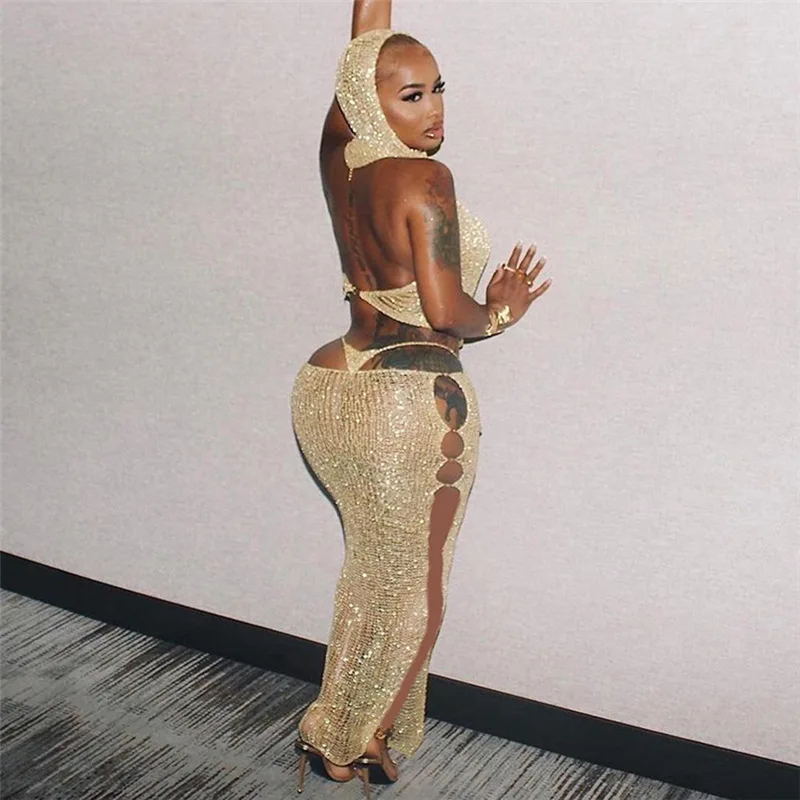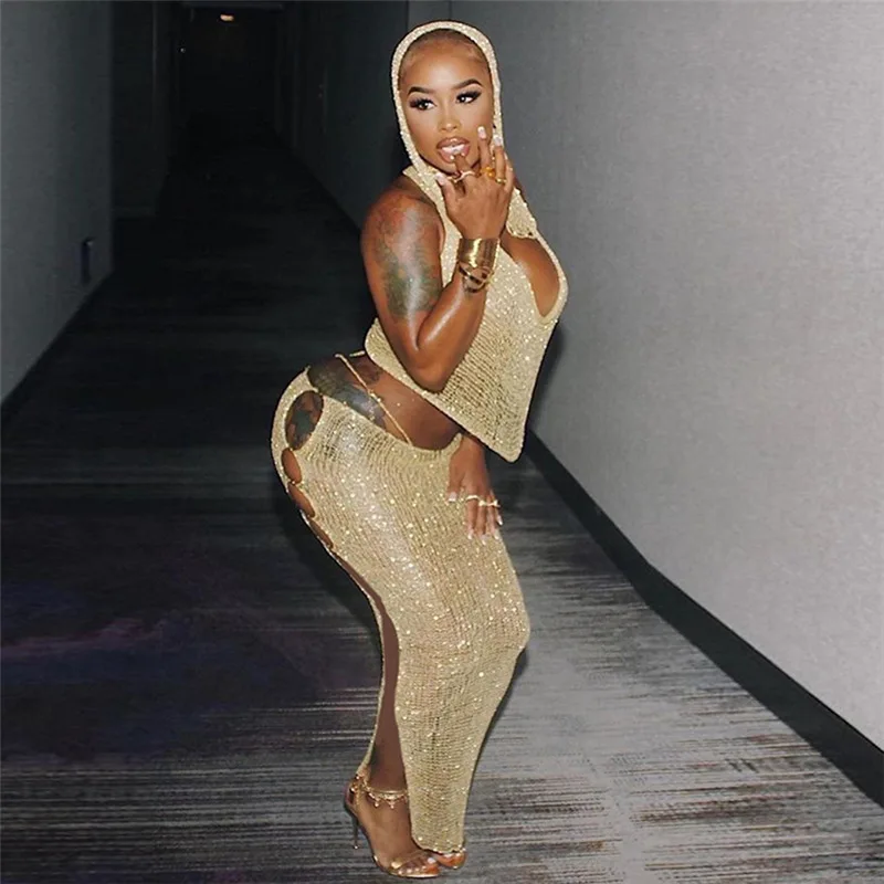 Specification: Solid Hollow Out Two Piece Skirt Set Women Sexy Backless Sleeveless Hooded Shiny Crop Tops+Side Slit Stunning Skirts Club Suits