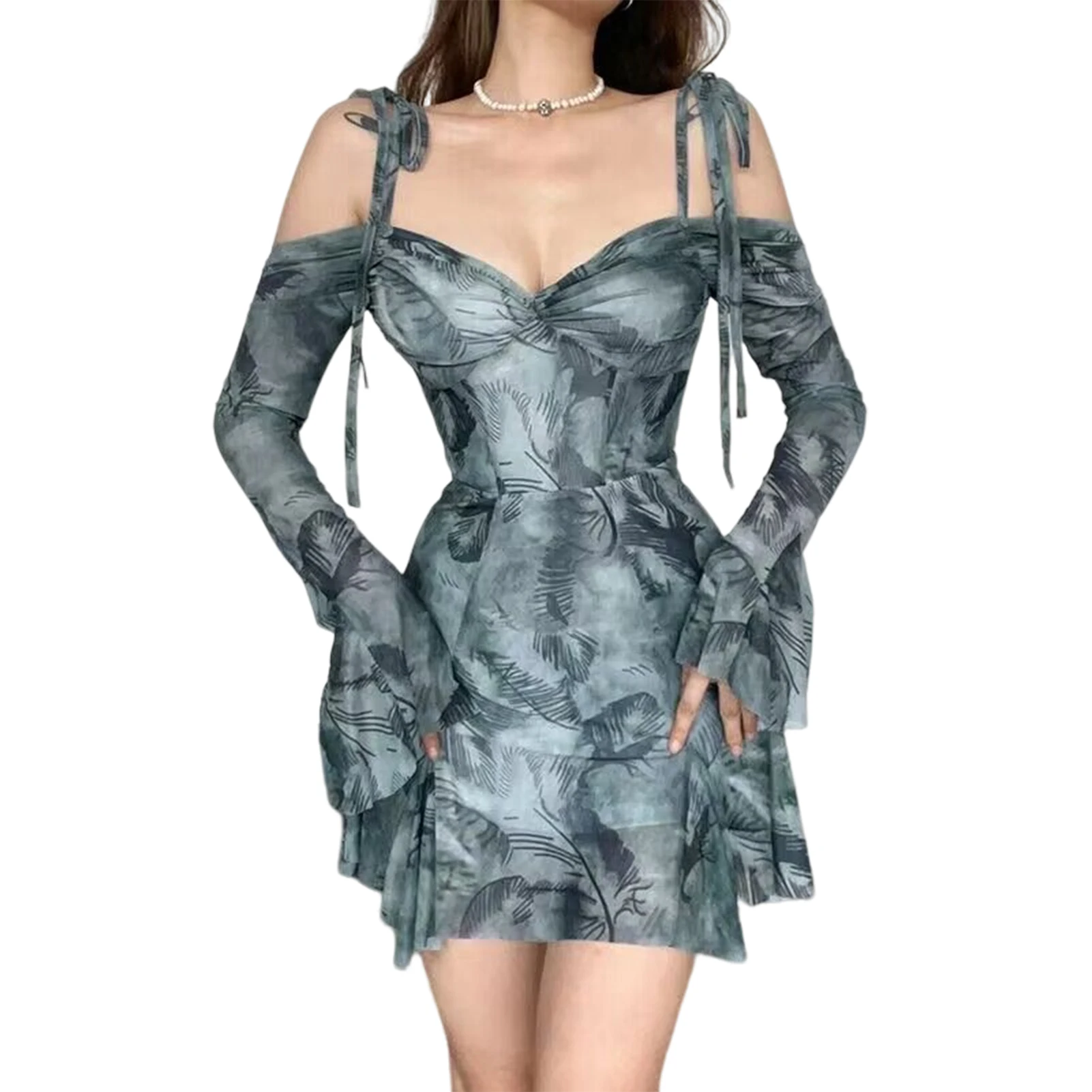 Spaghetti Strap Mini Dress for Women Summer Flare Sleeve Printed Lace-up Dresses Sexy Backless Off Shoulder Slim Fit Vestidos
