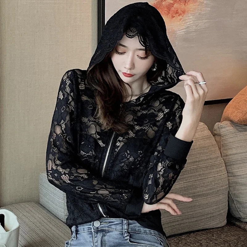 Spring Summer New Women Lace Floral Hoodies Hollow Out Sexy Zip-up Hooded Sweatshirts Female Club Party Sheer Pocket Top