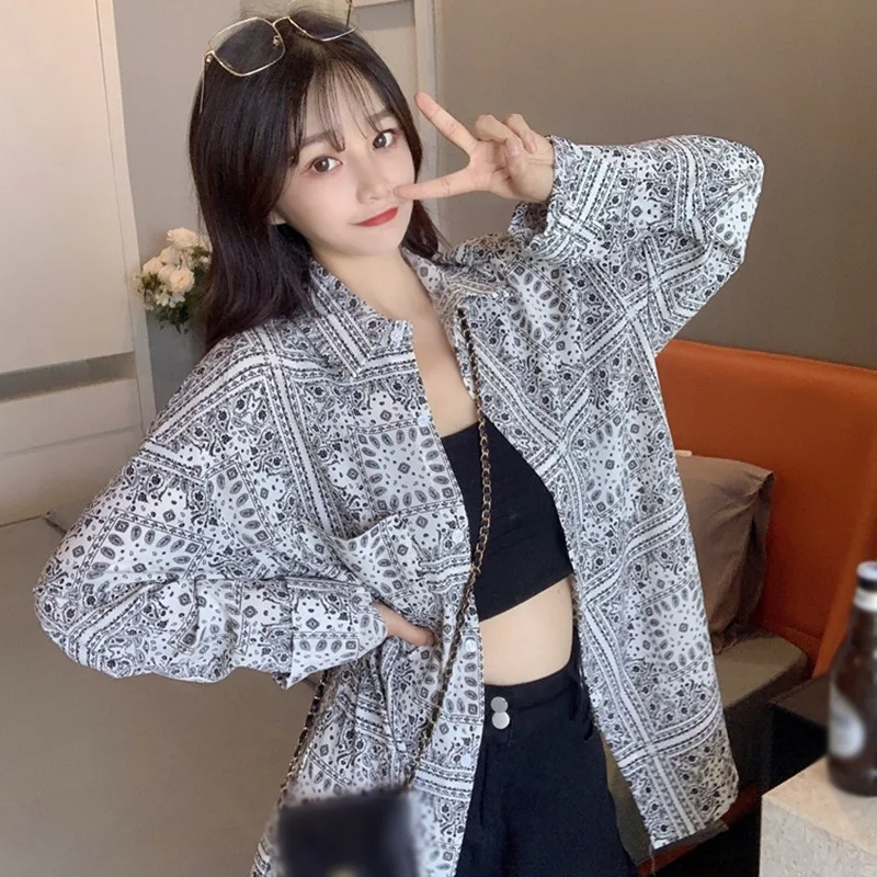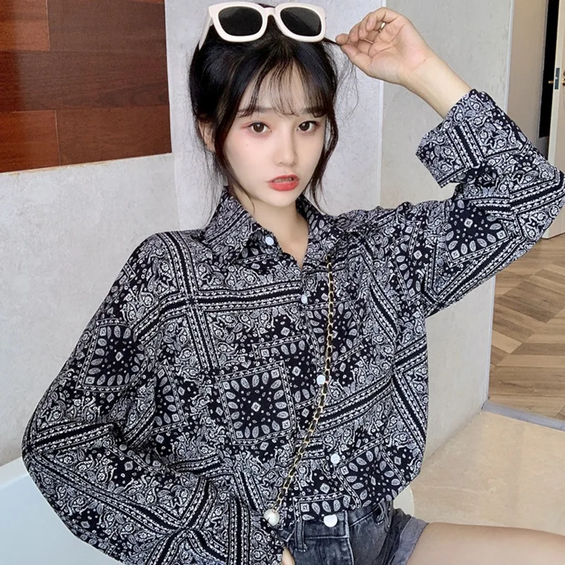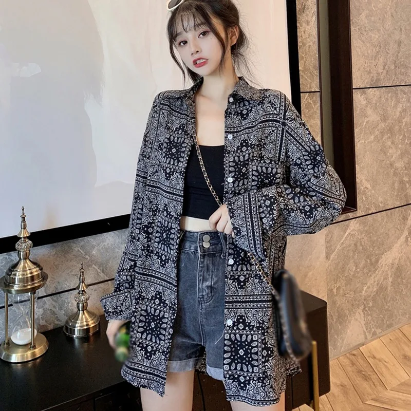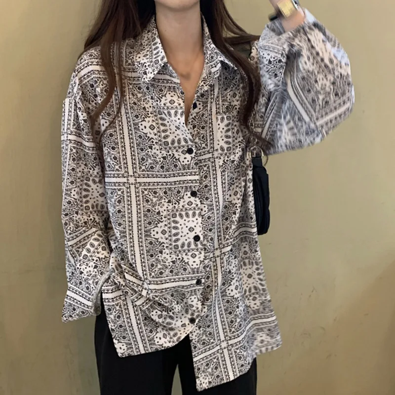 Features: retro, design, niche, printed, loose, slim, long sleeves, shirts, tops, women, shirts