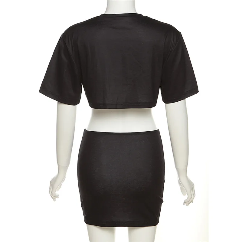 Street Style Letter Print Two Piece Set Women Summer Short Sleeve T-shirts Crop Tops Bodycon Mini Skirts Fashion Casual Suits