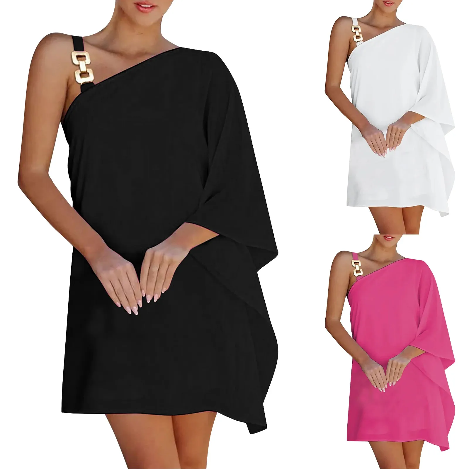 Summer Dress For Women One Shoulder Half Bat Sleeve Solid Casual Dresses Loose Metal Strap Beach Mini Sun Dress