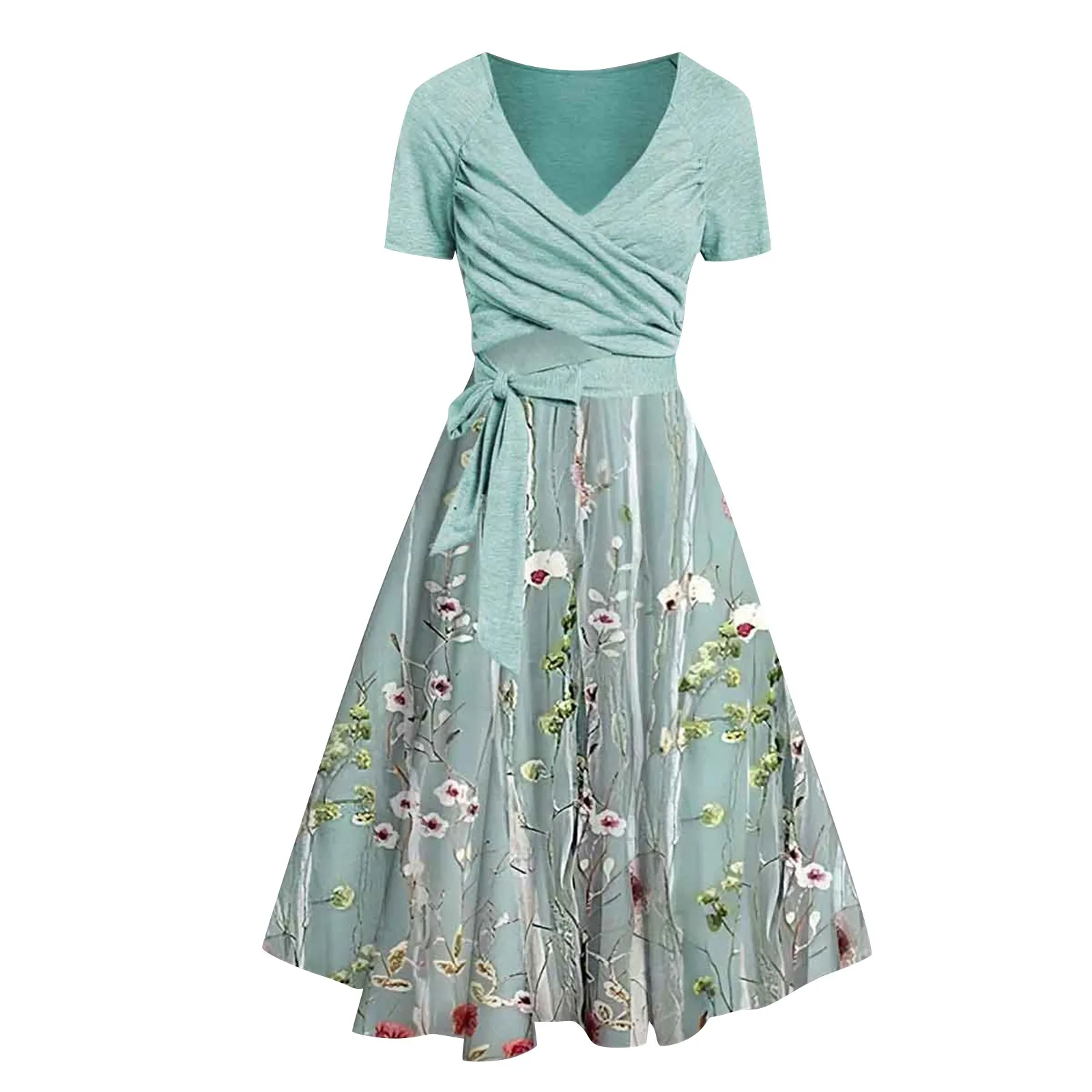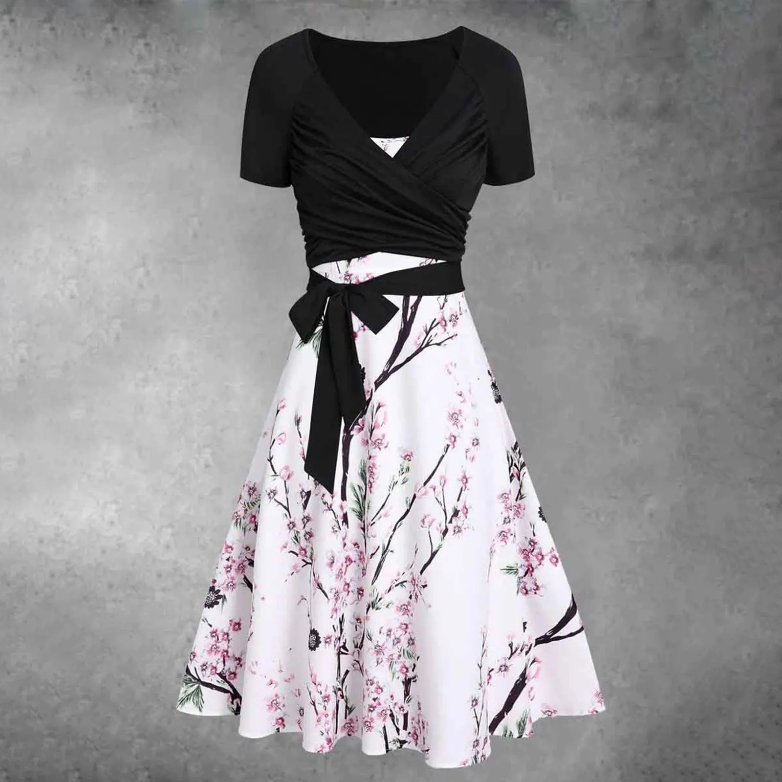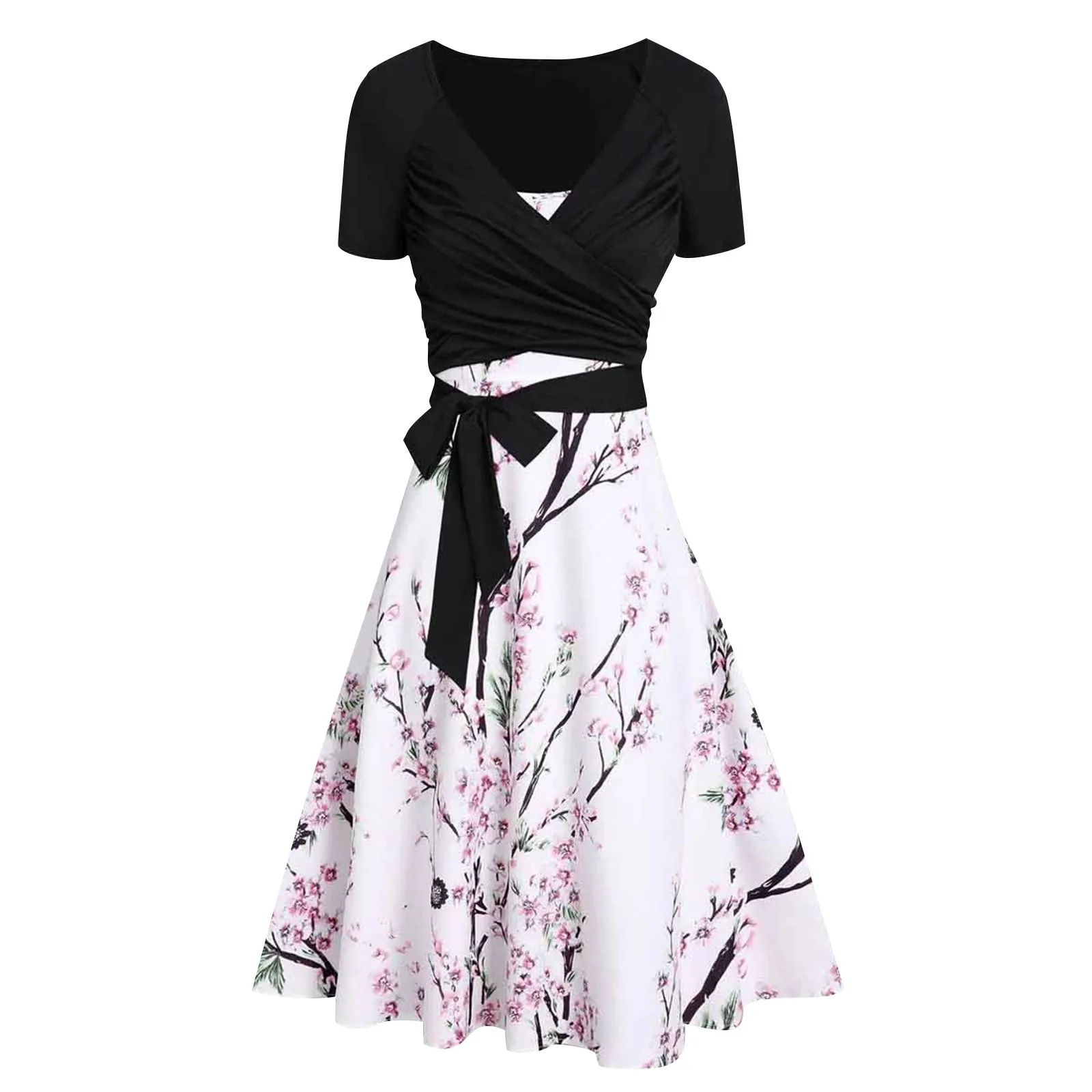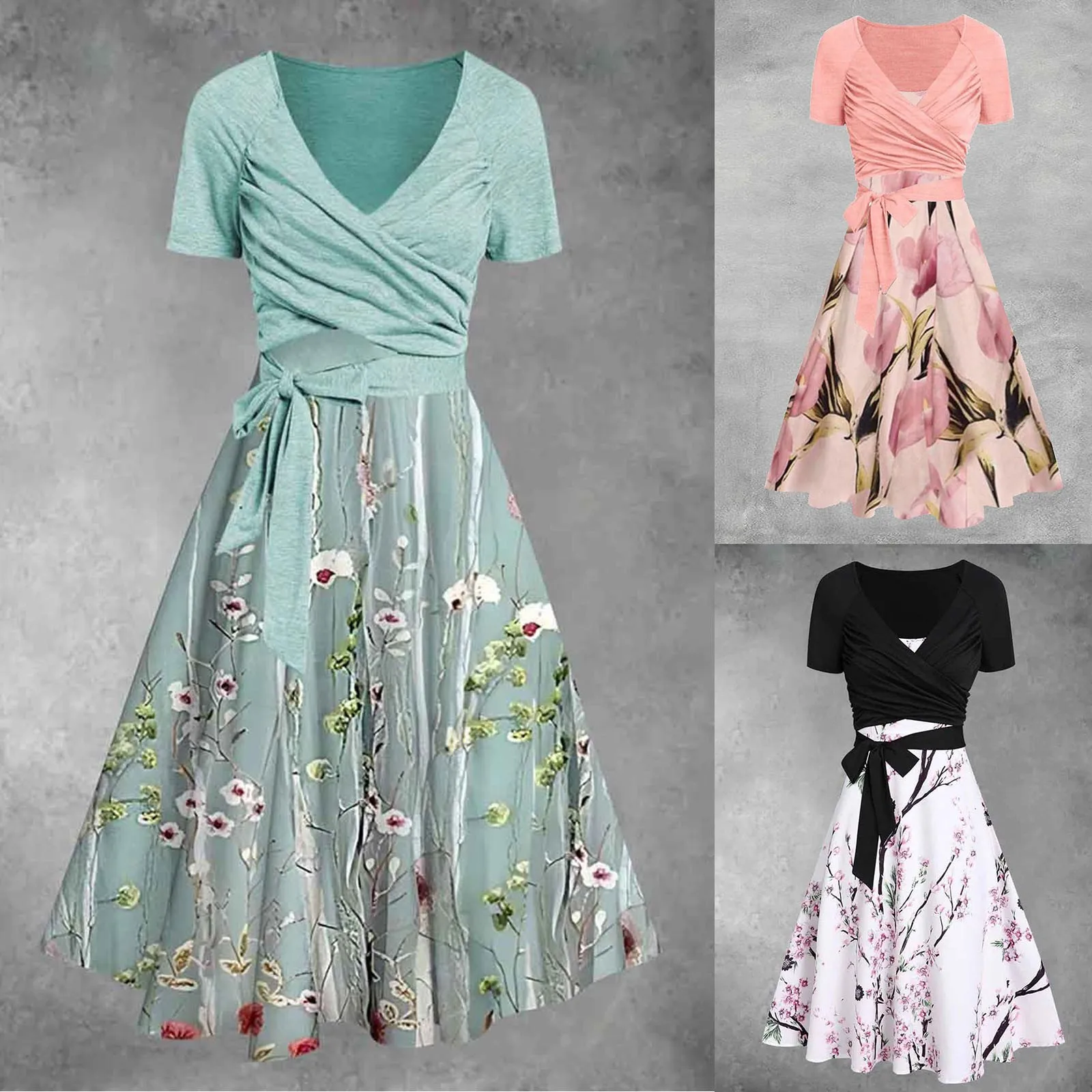 Women’s Princess Dress Sexy V-neck Printed Side Zipper Short Sleeve Dress