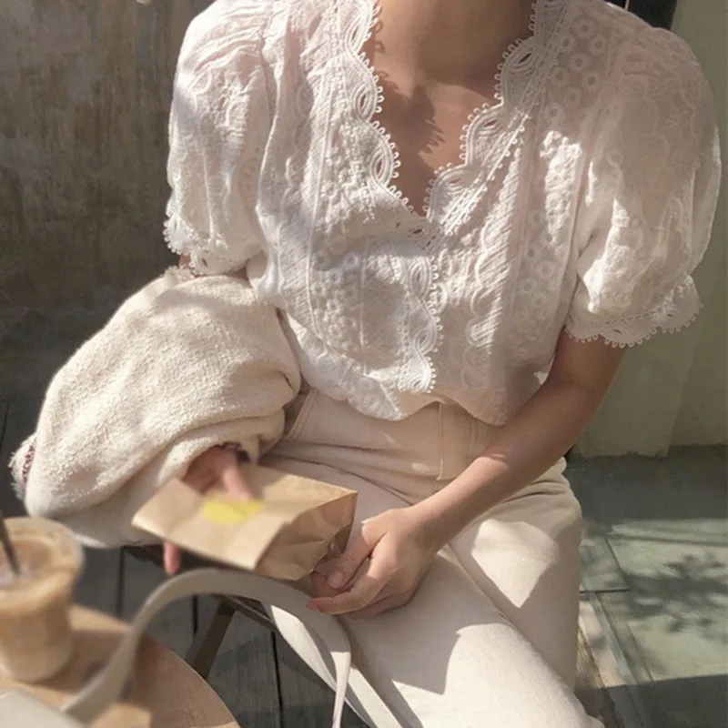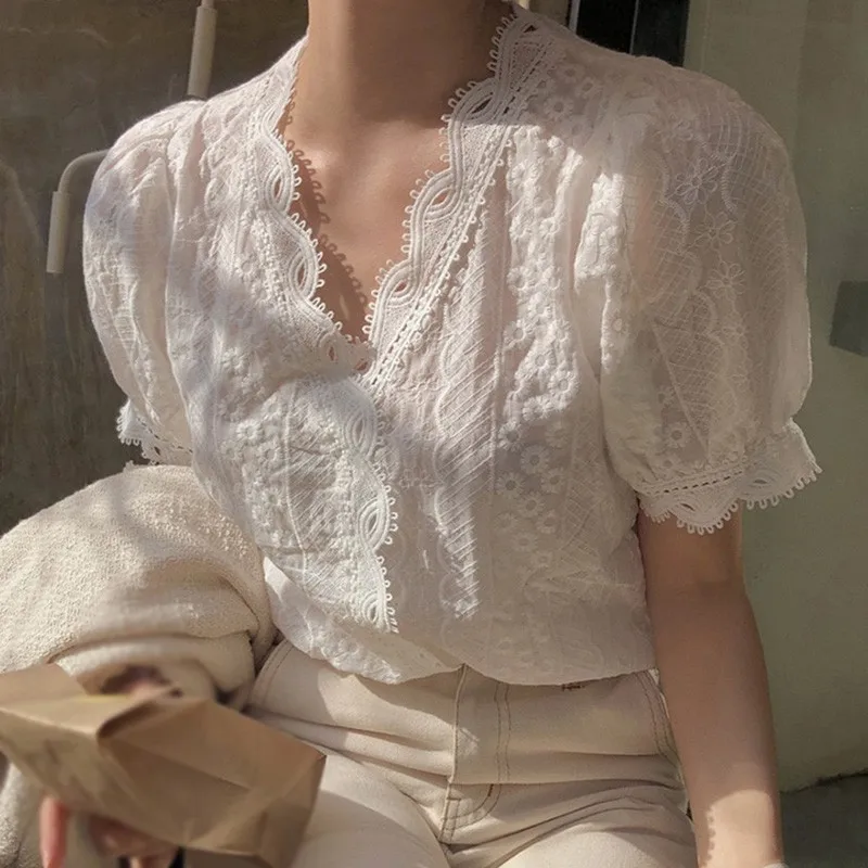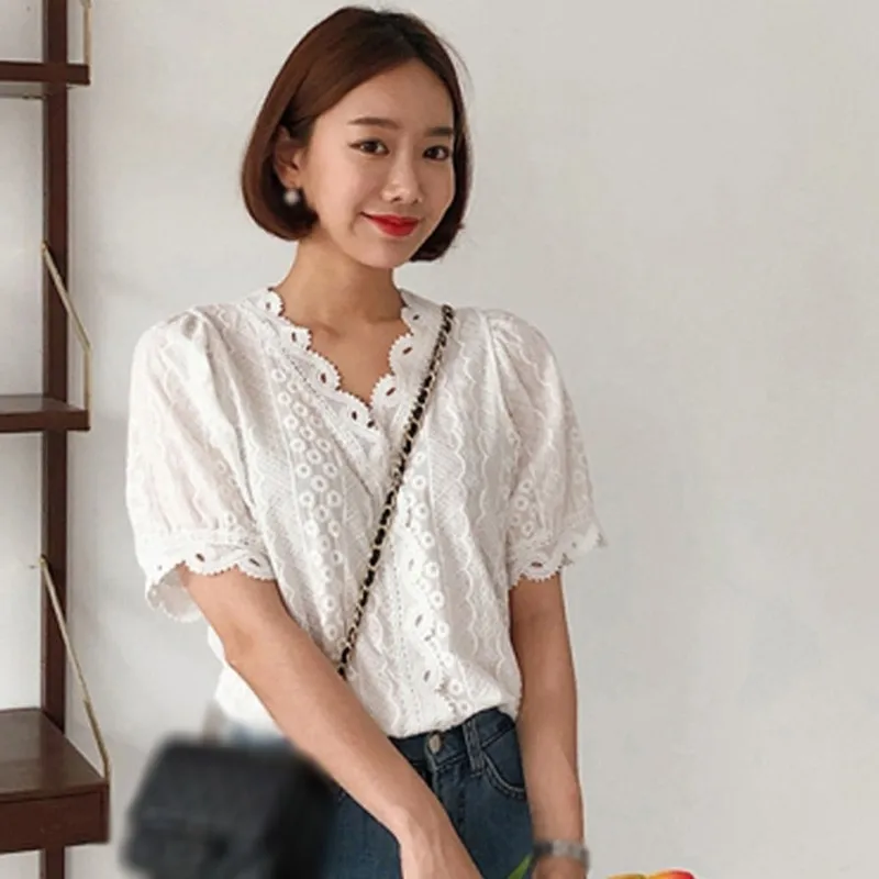 Summer Women Lace Hollow Out Blouse V-Neck Casual Short Sleeve Blouse Sweet Loose Solid Shirt Female Tops