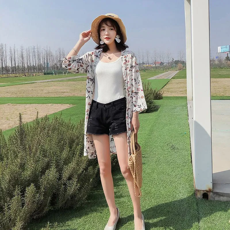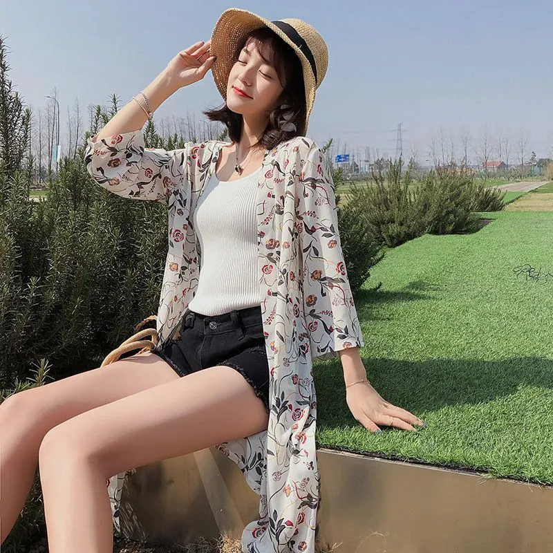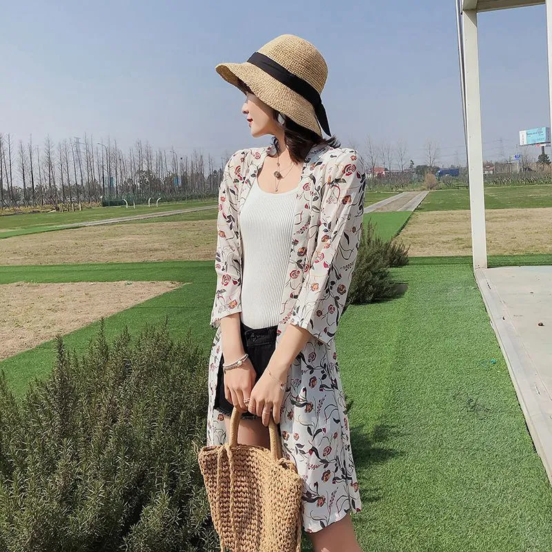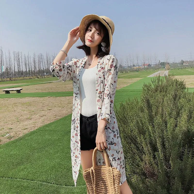 Specification: Summer Women’s Floral Kimino Blouse Mid-Length Chiffon Sun Protection Cardigan Korean Style Loose Shirt Clothing