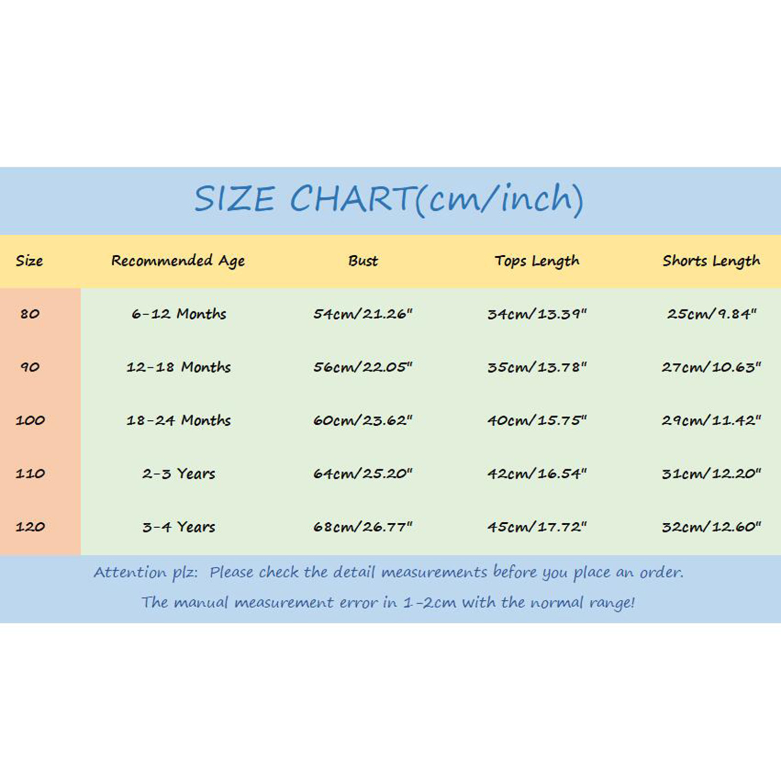 Size:110 | Recommended Age:2-3 Years | Bust:64cm/25.20” | Tops Length:42cm/16.54” | Shorts Length:31cm/12.20” |