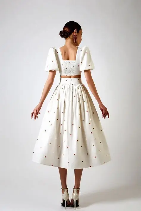 Specification: Two piece set Women Fashion Short Puff Sleeves Crop Top Vintage polka dot Midi Skirt 2021 Summer Woman Outfit Dress Sets Suits