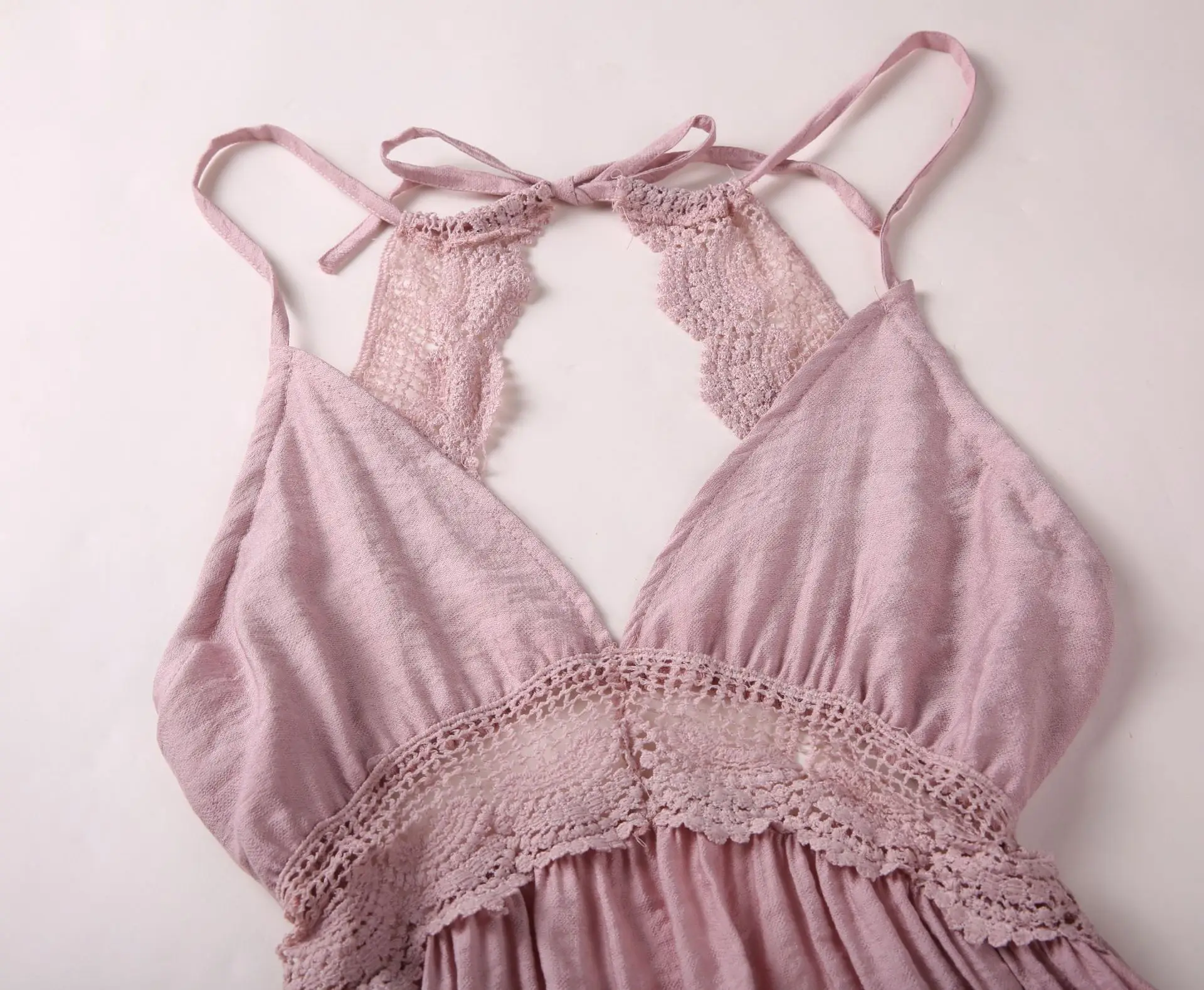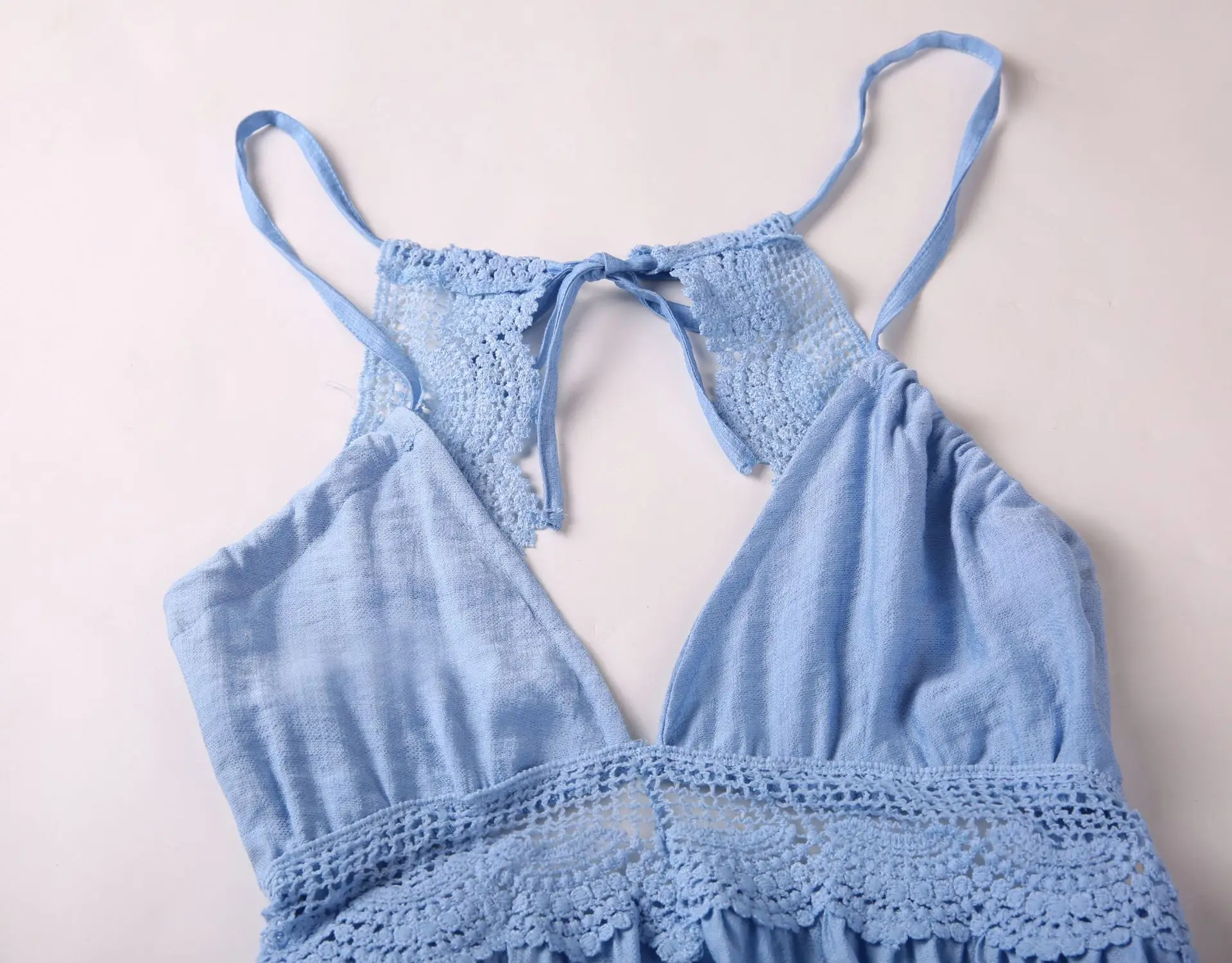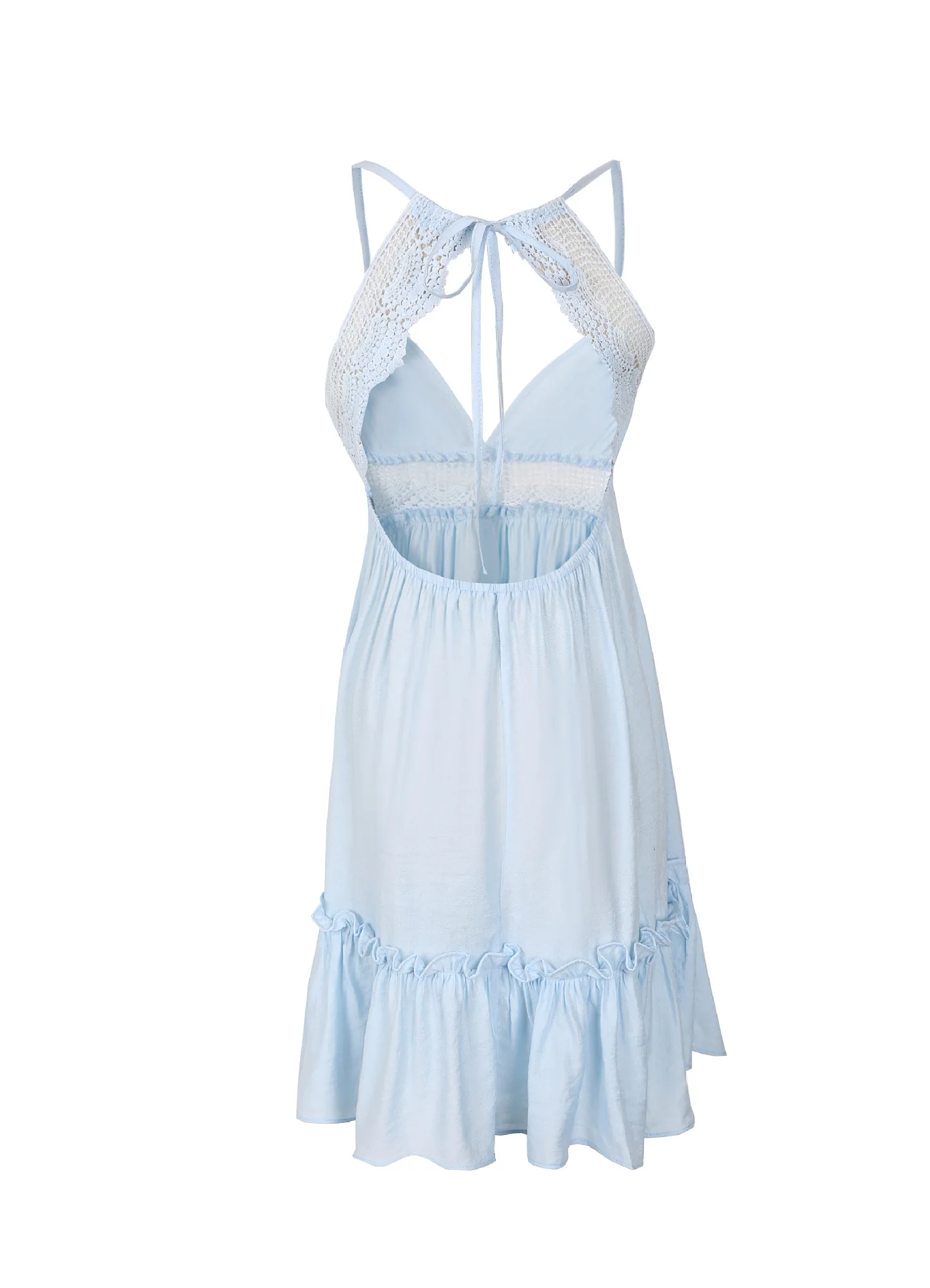 V Neck Sling Solid Color Open Back Large Swing Dress Women Clothing Sexy High Waist Loose Lace A Line Short Skirts Street Casual