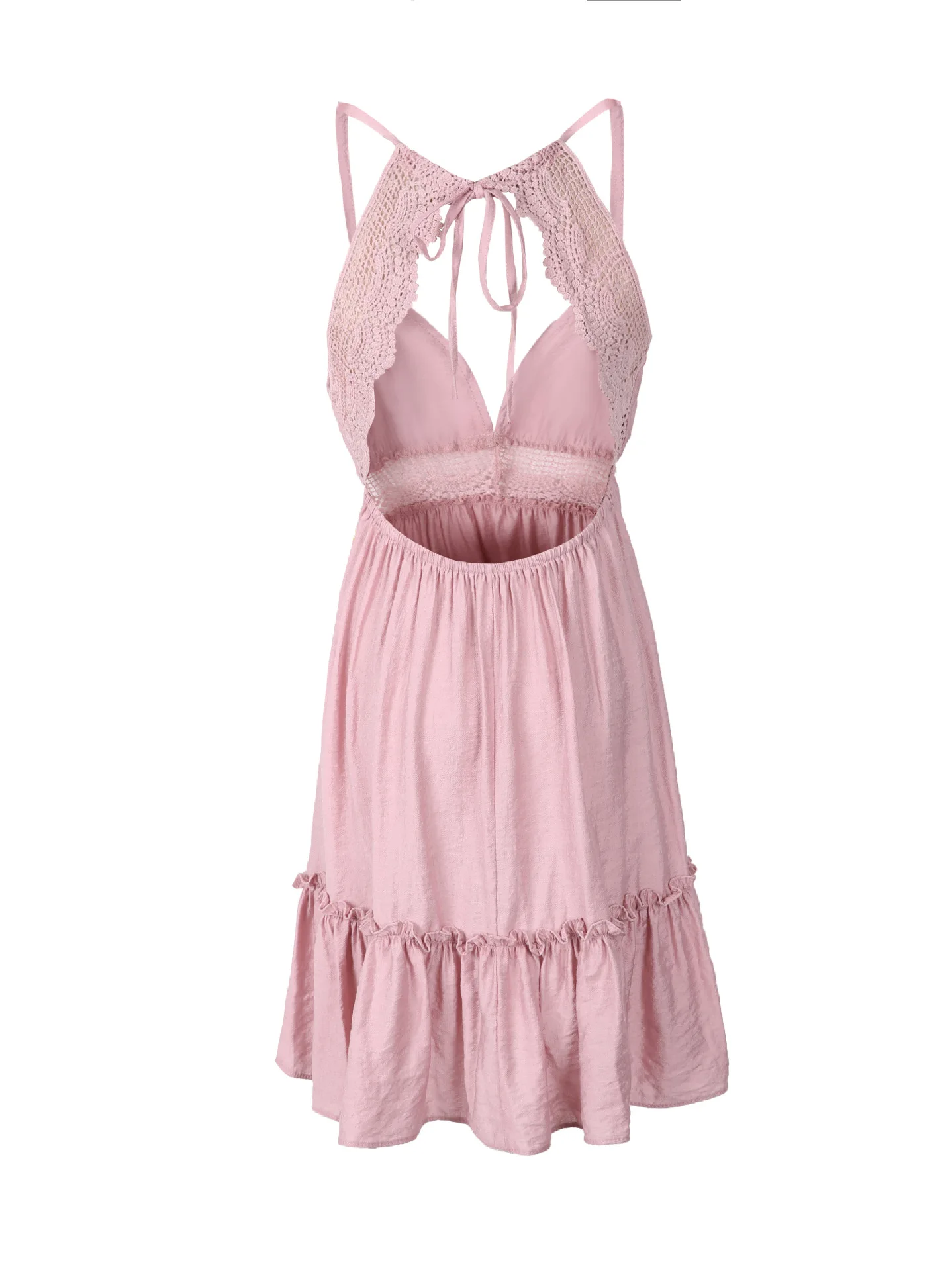 Specification: V Neck Sling Solid Color Open Back Large Swing Dress Women Clothing Sexy High Waist Loose Lace A Line Short Skirts Street Casual