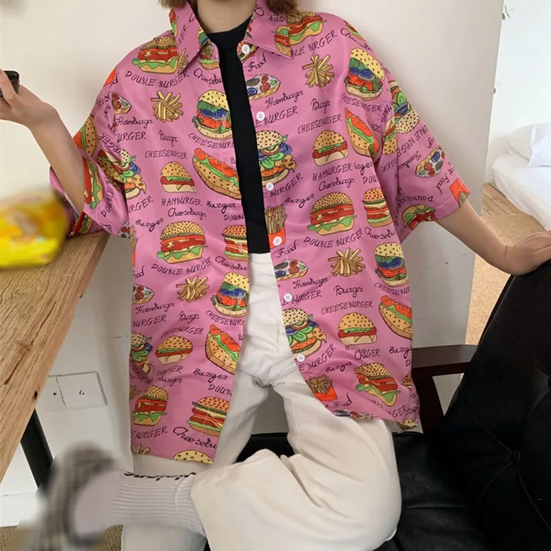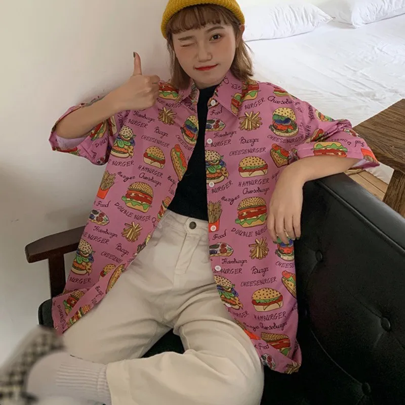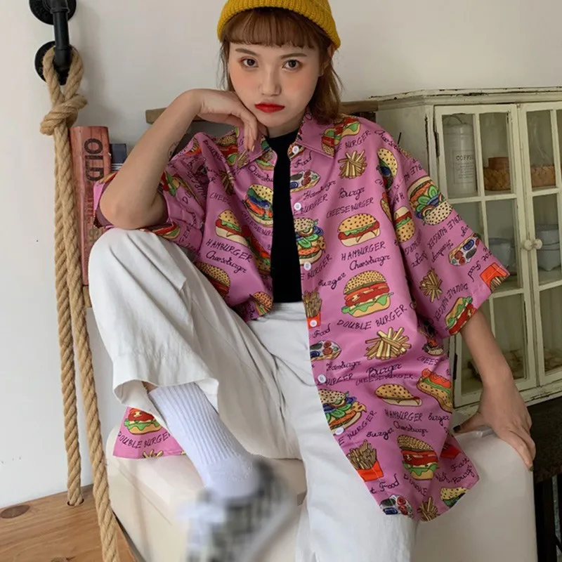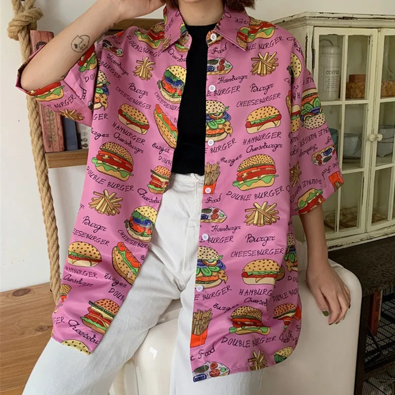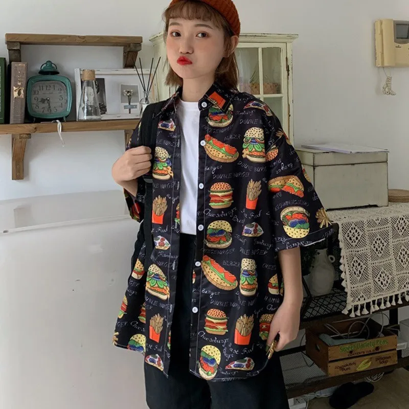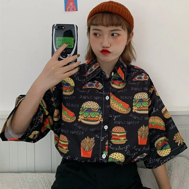 Vintage Print Blouse Women Harajuku Retro Print Shirt Summer Ladies Loose Turn-down Collar Streetwear Tops