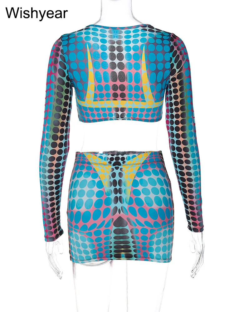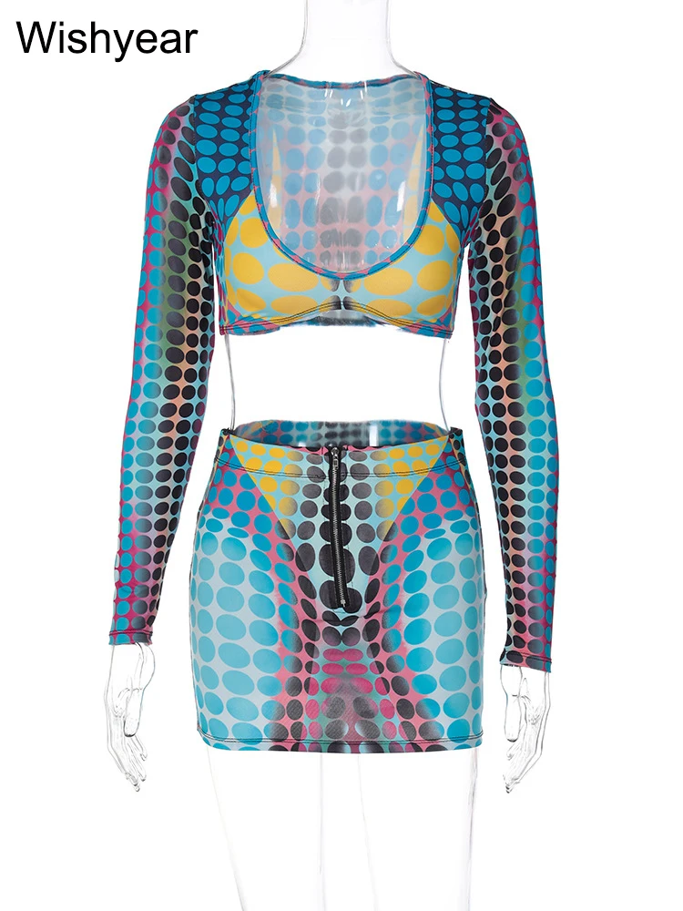Specification: Wishyear 2023 3D Polka Dot Printed Crop Top and Mini Skirts Baddie Matching Two Piece Dress Set for Women Sexy Night Club Outfit