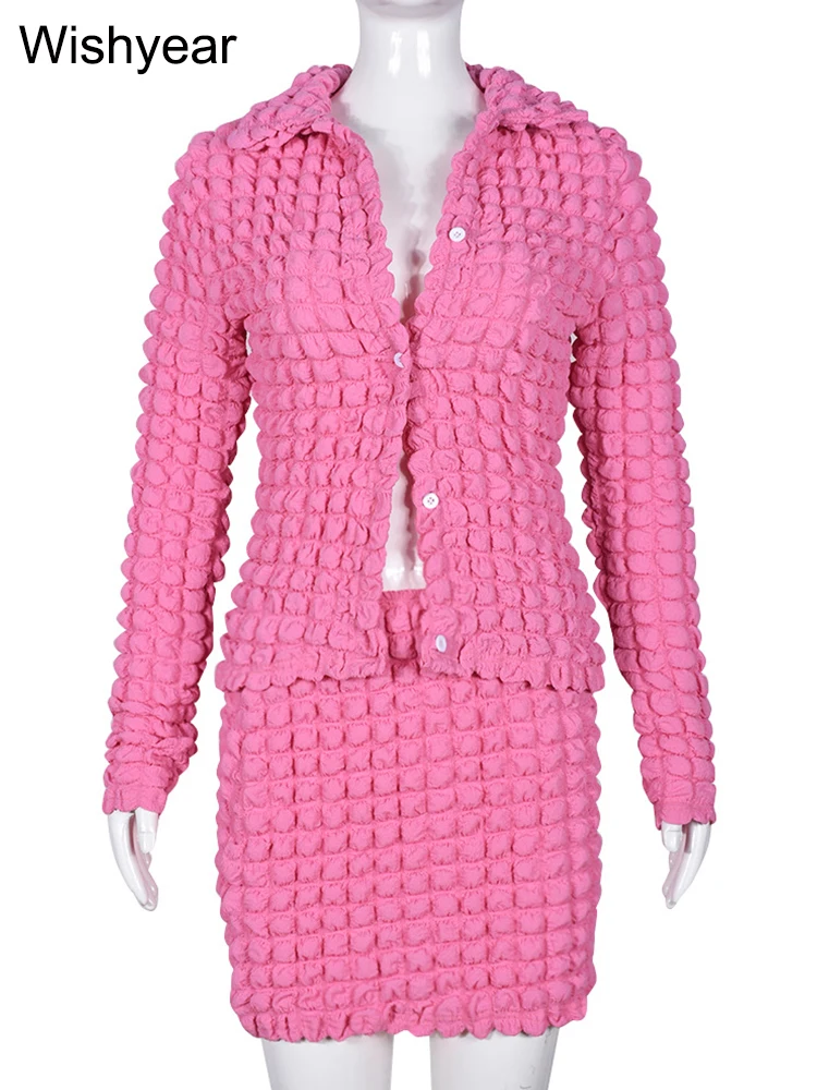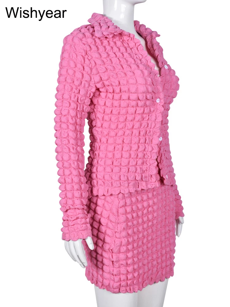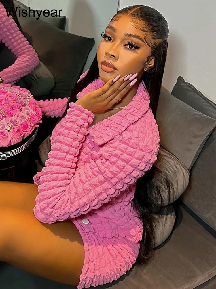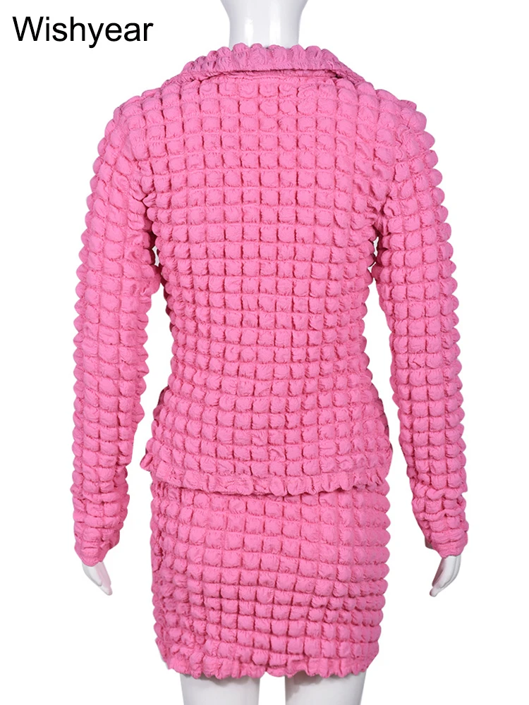 Wishyear New In Long Sleeve Jacket and Mini Skirt Two Piece Set for Women Sexy Party Club Popcorn Bodycon Stretch Dress Outfits