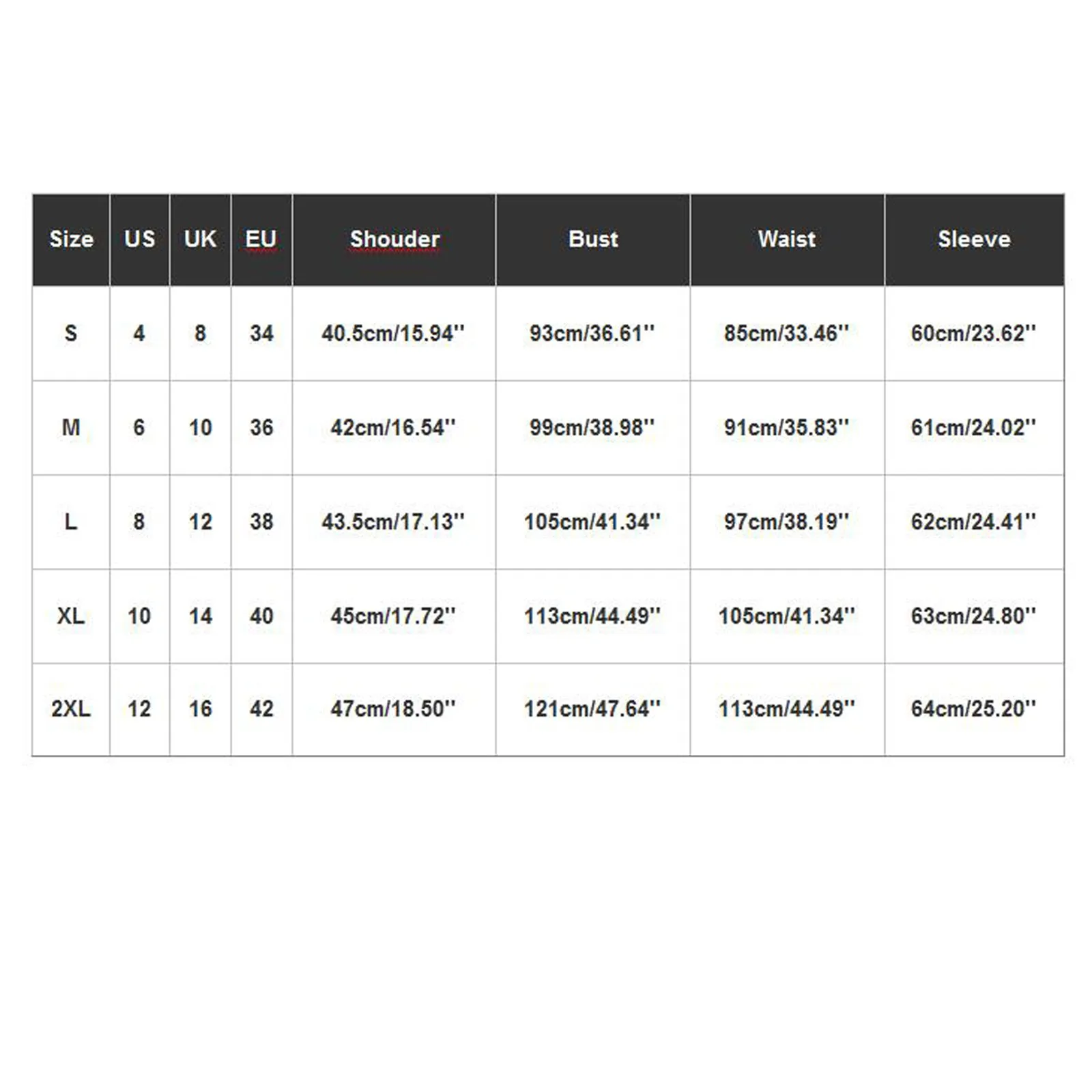 | Size | US | UK | EU | Shouder | Bust | Waist | Sleeve |